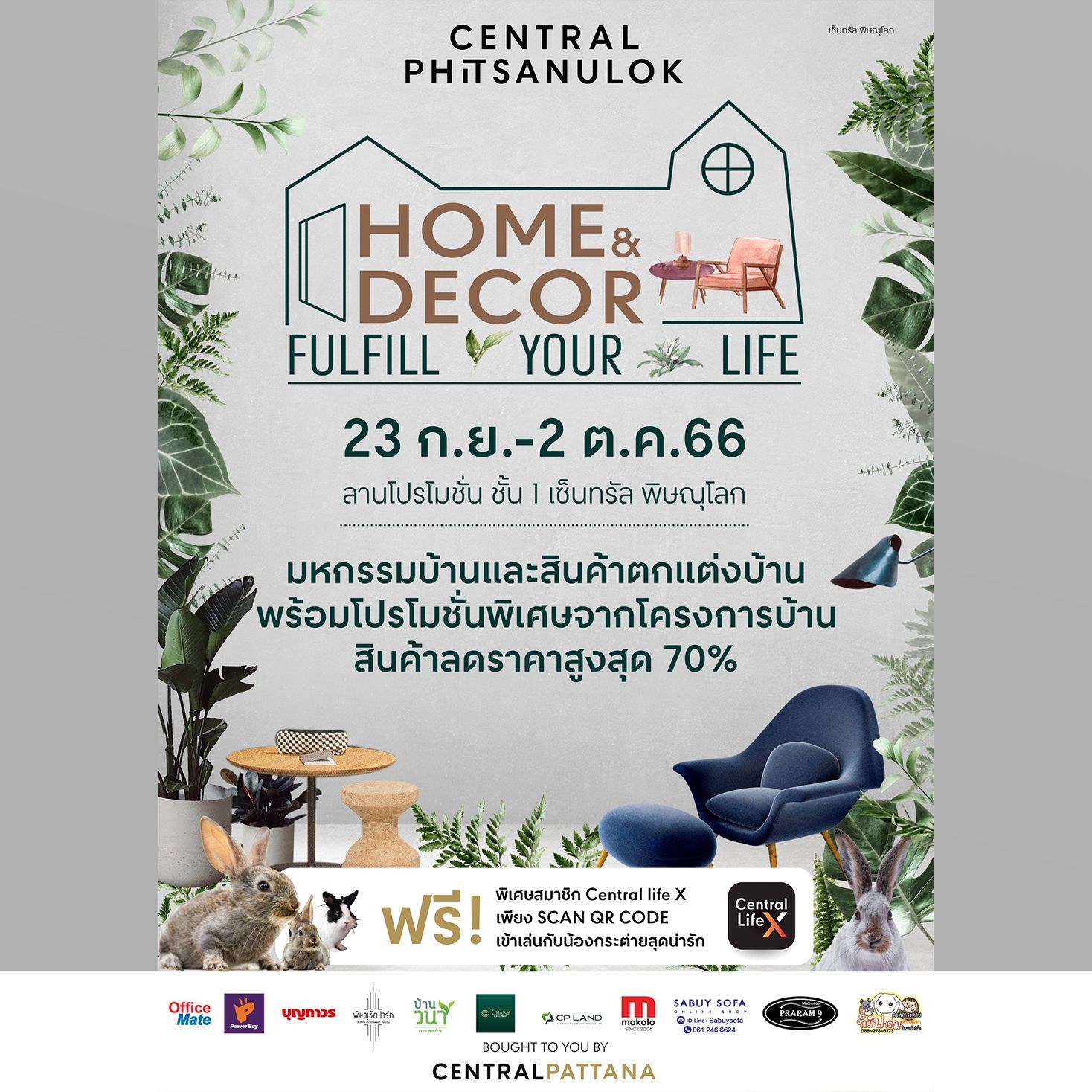 เตรียมพบกับงาน Home & Decor มหกรรมบ้านและสินค้าตกแต่งบ้านในคอนเซ็ปต์ Fulfil Your Life เอาใจคนรักบ้าน พบโปรโมชั่นพิเศษจากโครงการบ้าน สินค้าตกแต่งบ้านและสวน ลดราคาสูงสุด 70% พร้อมกับสิทธิพิเศษ Central Life X ร่วมสนุกกับกิจกรรมโซนกระต่ายภายในงาน ฟรี ! พบกันวันที่ 23 ก.ย. - 2 ต.ค. 2566 ณ ลานโปรโมชั่นชั้น 1 เซ็นทรัล พิษณุโลก