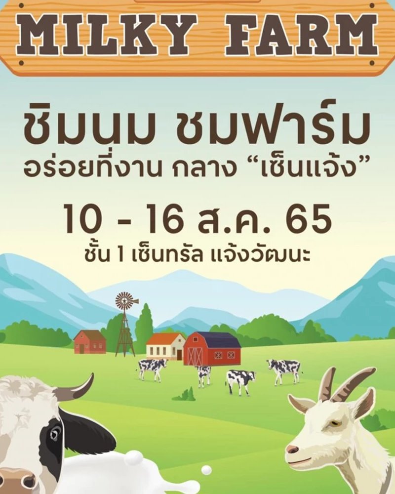 เซ็นแจ้ง Milky Farm วันที่ 10 - 16 สิงหาคม 2565 ณ เซ็นทรัล แจ้งวัฒนะ ชวนทุกคนมา ชิมนม ชมฟาร์ม อร่อยที่งานกลาง "เซ็นแจ้ง" พบกับงานที่รวบรวมผลิตภัณฑ์จาก "นม" ไว้มากที่สุด ครั้งแรกที่ เซ็นทรัล แจ้งวัฒนะ พร้อมสนุกสนานกับกิจกรรม เพื่อครอบครัวตลอด 7 วัน 12 ส.ค. Workshop เมนูจากนม ต้อนรับวันแม่กับ "น้องมาร์ค" มาสเตอร์เชฟจูเนียร์ 13 ส.ค. พบความน่ารัก กับการประกวด "หนูน้อย Milky Farm" 14 ส.ค. ร่วมชิม ร่วมชม เมนูเด็ดจาก Kingkong Sweet กับการ Cooking Show นอกจากนี้ยังมีมุมสำหรับ จิบนม ชมฟาร์ม พร้อมถ่ายภาพ อัพโซเชียลและกิจกรรมสำหรับน้อง ๆ หนู ๆ กับการป้อนนมแพะ และเลือกชิมเมนูจากนมกว่า 50 ร้านค้า แล้วมาพบกันในงาน "เซ็นแจ้ง" Milky Farm วันที่ 10 - 16 ส.ค. 65 ณ ลานโปรโมชั่น ชั้น 1
