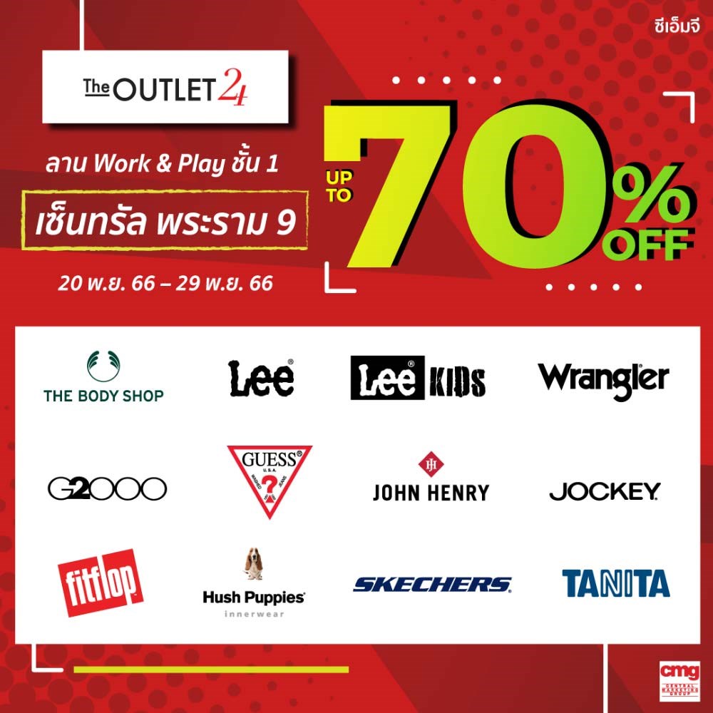 The Outlet 24 โปรโมชั่นสุดคุ้ม ลดทุกไอเทม! ช้อปจัดเต็มกับแบรนด์ดังในเครือ CMG ที่มาพร้อมส่วนลดสูงสุดถึง 70% เริ่มแล้วตั้งแต่วันที่ 20 พ.ย. 66 - 29 พ.ย. 66 ณ ลาน Work & Play ชั้น 1 เซ็นทรัล พระราม 9