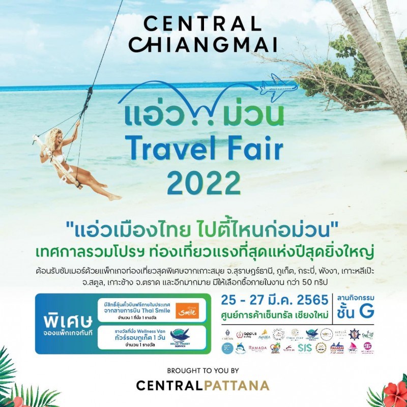 วันที่ 25 - 27 มีนาคม 2565 ณ ศูนย์การค้าเซ็นทรัล เชียงใหม่ เตรียมพบกับ เทศกาลรวมโปรฯ ท่องเที่ยวแรงที่สุดแห่งปี...สุดยิ่งใหญ่ "แอ่ว..ม่วน Travel Fair 2022" แอ่วเมืองไทย ไปตี้ไหนก่อม่วน ต้อนรับซัมเมอร์ด้วยแพ็กเกจท่องเที่ยวสุดพิเศษจากเกาะสมุย จ.สุราษฎร์ธานี, ภูเก็ต, กระบี่, พังงา, เกาะหลีเป๊ะ จ.สตูล, เกาะช้าง จ.ตราด และอีกมากมาย มีให้เลือกซื้อภายในงาน กว่า 50 ทริป แถมลุ้นรับรางวัลพิเศษ! จองแพ็กเกจภายในงานทันที มีสิทธิ์ลุ้นตั๋วบินฟรีภายในประเทศ จากสายการบินและพันธมิตรอีกมากมาย พบกันวันที่ 25 - 27 มี.ค. 2565 ณ ลานกิจกรรมชั้น G ศูนย์การค้าเซ็นทรัล เชียงใหม่