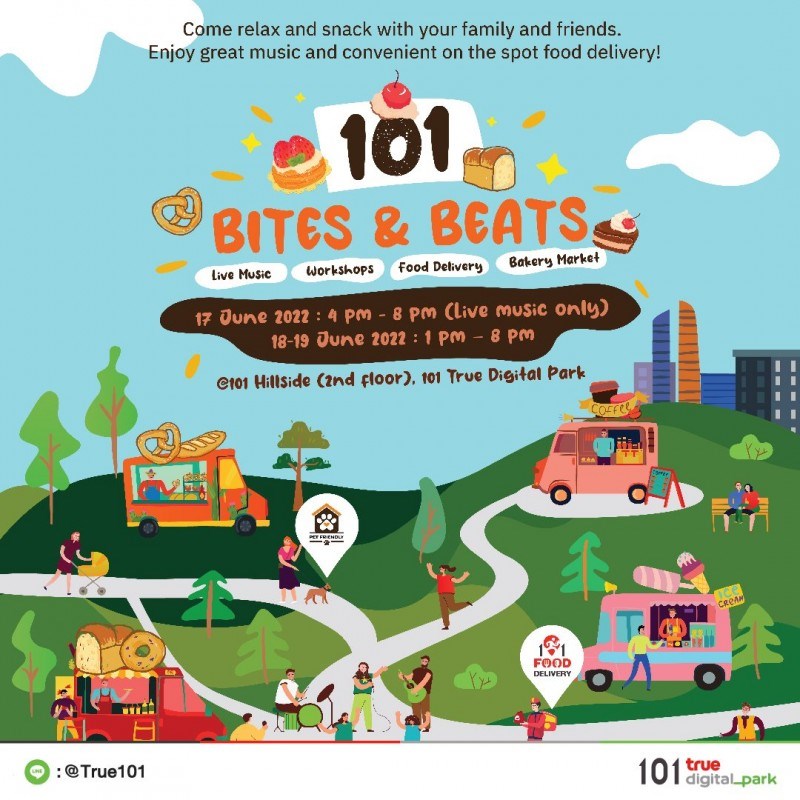 101 Bites & Beats วันที่ 18 - 19 มิถุนายน 2565 ณ 101 True Digital Park สัปดาห์หน้ามาแฮงค์เอ้าท์กัน! ครบ จบ ในงานเดียวที่งาน 101 Bites & Beats ทั้งเพลง กิจกรรมและอาหาร ในบรรยากาศชิล ๆ วันศุกร์ที่ 17 มิ.ย. มานั่งฟังดนตรีสด ชิลๆ หลังเลิกงานกันได้ที่ 101 Hillside ตั้งแต่เวลา 18.00 - 20.00 น. ฟรีไม่มีค่าใช้จ่าย หากใครหิวก็สามารถสั่งอาหารกับบริการ 101 Food Delivery บริการใหม่ที่ส่งอาหารให้คุณถึงที่แค่นั่งเฉย ๆ กดสั่งอาหาร และรอพนักงานนำไปส่งให้ มีให้เลือกกว่า 100 เมนูจากโซนฟู้ดคอร์ท Grab&Go เสาร์-อาทิตย์ 18 - 19 มิ.ย. สนุกสนานกันอย่างต่อเนื่องในช่วง weekend กับกิจกรรมมากมาย ไม่ว่าจะเป็น WEEKEND BAKERY MARKET มาร์เกตสำหรับคนรักเบเกอรี่ พบขนมอร่อยๆ กว่า 10 ร้านค้า UMBRELLA PAINTING ต้อนรับหน้าฝนนี้กับเวิร์คช้อปเพ้นท์ร่ม ฟรีสไตล์ ในลวดลายที่บอกความเป็นคุณ ตั้งแต่เวลา 15.00 น. เป็นต้นไป LIVE MUSIC นั่งฟังดนตรีสดชิลๆ ในบรรยากาศในสวนร่มรื่น วันเสาร์-อาทิตย์เวลา 16.00 - 18.00 น.