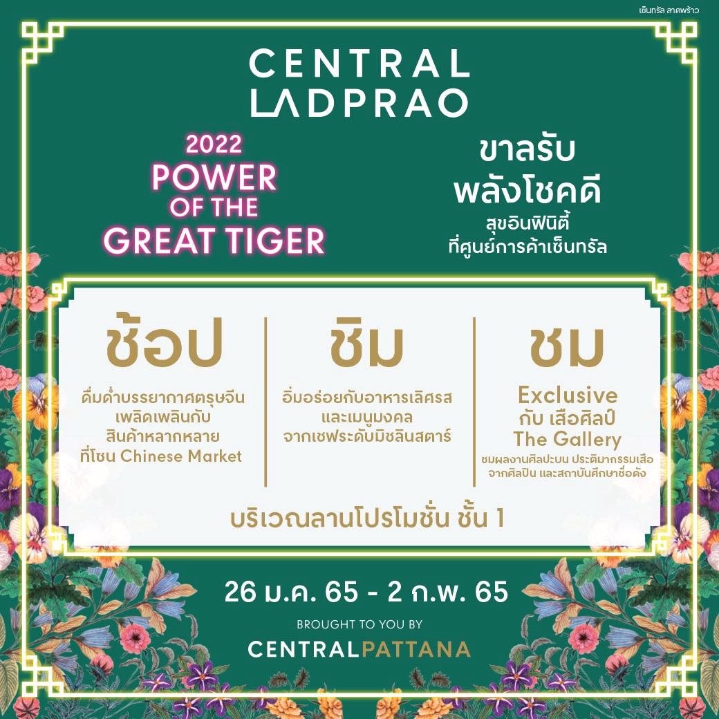2022 Power of the Great Tiger @Ladprao ดื่มด่ำกับบรรยากาศงานตรุษจีนสุดขลังรับปีเสือน้ำ เพิ่มพลังโชคลาภให้ไหลมาเทมา ด้วยเมนูมงคลจากเชฟระดับมิชลินสตาร์ และเชฟจากโรงแรมห้าดาว ช้อปปิ้งเพลิน ๆ กับ Chinese Market ที่ยกย่านเยาวราชมาไว้ใจกลางเซ็นทรัลลาดพร้าว ชมการแสดงเชิดมังกร-สิงโตทองคำ ขานรับปีขาลมงคลให้ดังกึกก้อง สุด Exclusive กับ เสือศิลป์ The Gallery ชมผลงานศิลปะบนประติมากรรมเสือจากศิลปิน และสถาบันศึกษาชื่อดัง ตั้งแต่วันที่ 26 ม.ค. - 2 ก.พ. 2565 ที่บริเวณชั้น 1 ศูนย์การค้าเซ็นทรัล ลาดพร้าว