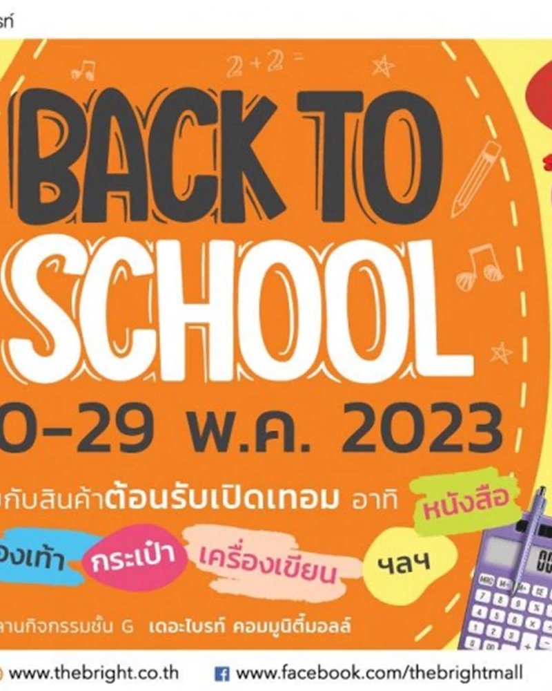 เตรียมพบกับงาน Back To School วันที่ 10 - 29 พ.ค. นี้ จัดเต็มกับไอเท็มเด็ดต้อนรับเปิดเทอม อาทิเช่น เครื่องเขียนและอุปกรณ์การเรียนจาก B2S หนังสือจากสำนักพิมพ์ส่งเสริมการอ่าน ชุดกีฬา รองเท้า และอีกมากมาย ณ บริเวณลานกิจกรรมชั้น G เดอะไบร์ท