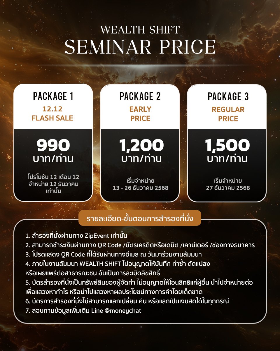 ผู้จัดขอสงวนสิทธิ์ในการแก้ไขข้อมูลภายหลังทุกกรณี กรุณาส่งเอกสารรับรองการหักภาษี ณ ที่จ่าย มาที่บริษัท มันนี่ แชท จำกัด และแจ้งเลขพัสดุมาทางอีเมล marketing@moneychat.co.th หัวข้อ เอกสารหักภาษี ณ ที่จ่ายงาน WEALTH SHIFT