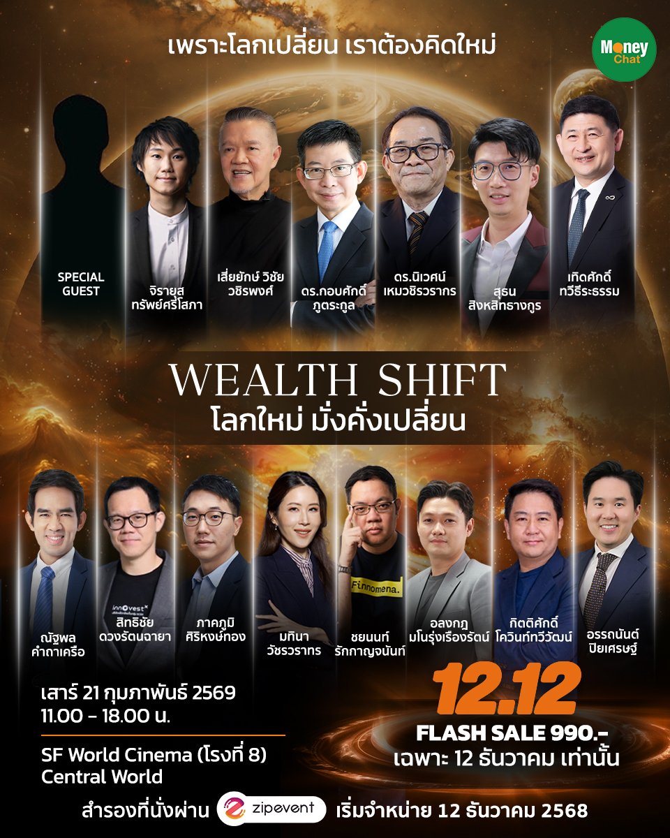 ทาง Money Chat สื่อด้านเศรษฐกิจ การเงิน และการลงทุน พร้อมนำเสนอองค์ความรู้ที่สอดคล้องกับการเปลี่ยนแปลงครั้งนี้ จึงได้จัดงาน MONEY CHAT MEET AND GREET #5 ภายใต้ตีม WEALTH SHIFT: โลกใหม่ มั่งคั่งเปลี่ยน เพื่อเปิดมุมมองใหม่ต่อเศรษฐกิจโลก การลงทุน และโอกาสที่จะกำหนดอนาคตความมั่งคั่งในยุคเปลี่ยนผ่าน