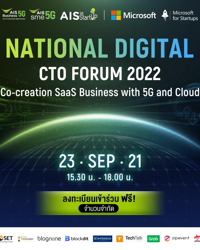 AIS Business ร่วมกับ AIS The StartUp ขอเชิญผู้สนใจเข้าร่วมงานเสวนาออนไลน์ ‘National Digital CTO FORUM 2022’ : Co-creation SaaS Business with 5G and Cloud ที่จะพาทุกท่านไปพบกับ Speakers จากผู้บริหารและพันธมิตรผู้นำด้านเทคโนโลยีทั้งในไทยและระดับโลก