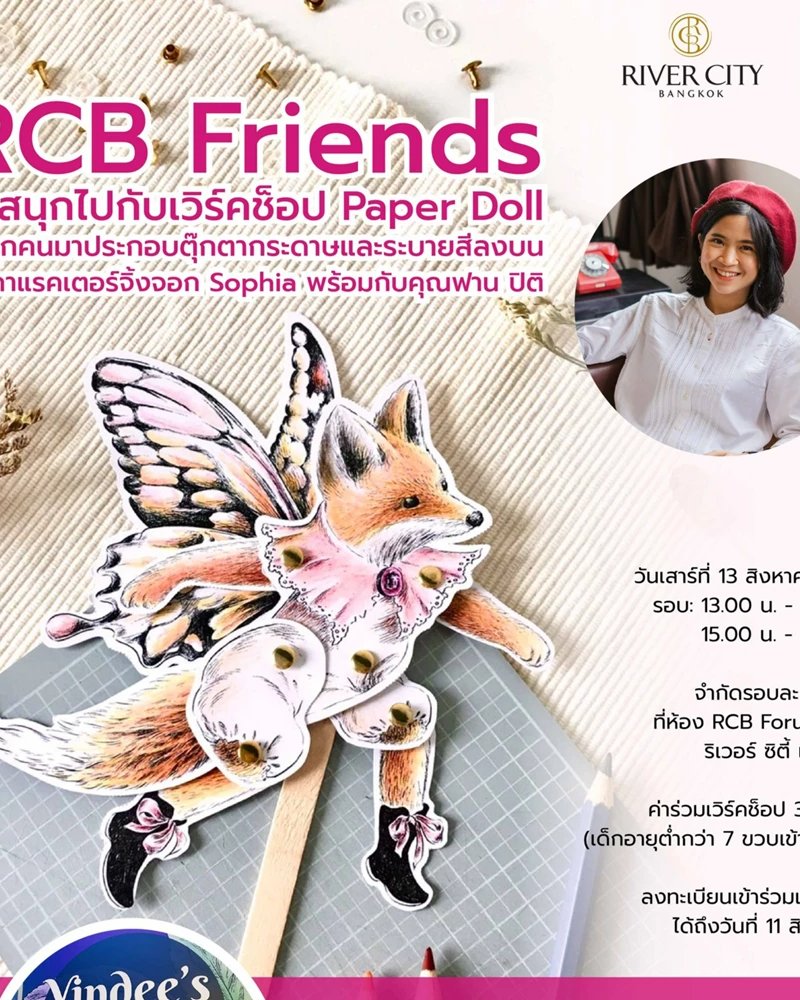 ต้อนรับเดือนแห่งวันแม่ RCB Friends มาสนุกไปกับเวิร์คช็อป Paper Doll ให้ทุกคนได้มาประกอบตุ๊กตากระดาษและระบายสีลงบนเจ้าคาแรคเตอร์จิ้งจอก Sophia พร้อมกับคุณฟาน ปิติ faan.peeti ศิลปินคนเก่ง ผู้สร้างสรรค์นิทรรศการ Yindee’s Mysterious Friends