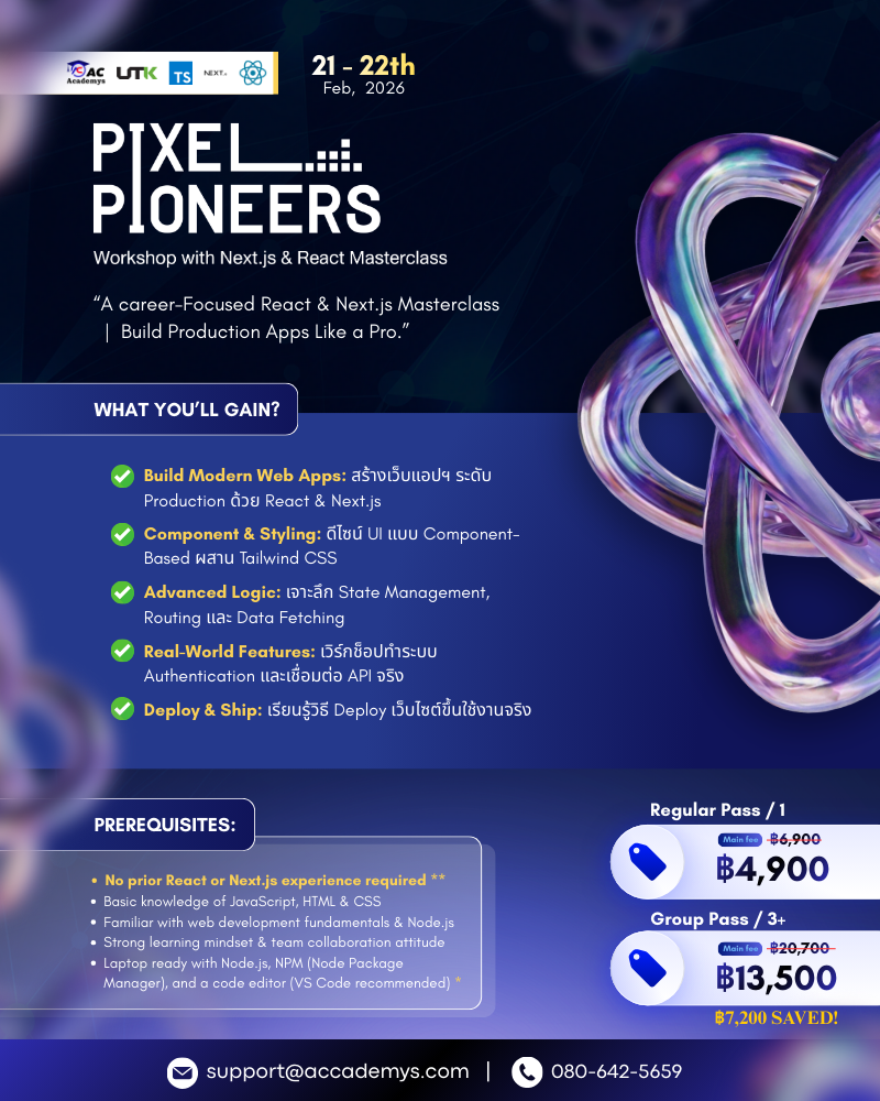 เข้าร่วม เวิร์กช็อป 2 วันแบบลงมือปฏิบัติ เพื่อก้าวสู่การเป็นนักพัฒนาเว็บแอปพลิเคชันระดับแนวหน้าด้วย ReactJS และ Next.js! เรียนรู้การสร้าง UI ที่ทันสมัย การจัดการสถานะ การเชื่อมต่อ API และการทำ Routing เพื่อพัฒนาเว็บแอปพลิเคชันที่มีประสิทธิภาพ เหมาะสำหรับนักพัฒนาที่ต้องการยกระดับทักษะหรือเริ่มต้นกับ React และ Next.js