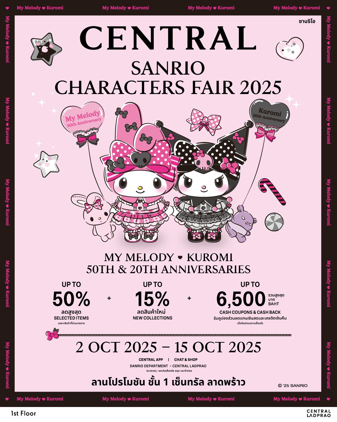 ชวนทุกคนมาร่วมฉลอง My Melody ครบรอบ 50 ปี และ Kuromi ครบรอบ 20 ปี ในงาน Sanrio Character Fair 2025 จัดเต็มสินค้าน่ารักทุกชิ้น พร้อมส่วนลดสูงสุด 50% สาวกตัวจริง ห้ามพลาดเด็ดขาด!