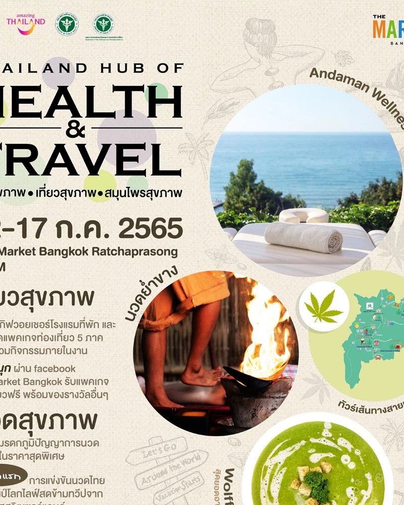 ศูนย์การค้า เดอะ มาร์เก็ต แบงคอก (ราชประสงค์) ร่วมกับ การท่องเที่ยวแห่งประเทศไทย (ททท.) กระทรวงการท่องเที่ยวและกีฬา , กรมการแพทย์แผนไทยและการแพทย์ทางเลือก กระทรวงสาธารณสุข เครือข่ายท่องเที่ยว เครือข่ายนวดและสปา และเครือข่ายกัญชากัญชงทางการแพทย์ ขอเชิญร่วมจัดงาน Thailand Hub of Health & Travel สุดยิ่งใหญ่ประจำปี รวมบูธกิจกรรมท่องเที่ยว นวด และสมุนไพร ไว้มากกว่า 100 บูธ สุดคุ้ม!! ตอบรับเทรนด์การท่องเที่ยวแบบเวลเนส ทัวริสซึ่ม แสดงศักยภาพของประเทศไทยสู่การเป็น Global Medical & Wellness Hub ระหว่างวันที่ 12 – 17 ก.ค. 2565 ณ ศูนย์การค้า เดอะ มาร์เก็ต แบงคอก ราชประสงค์ ชั้น M