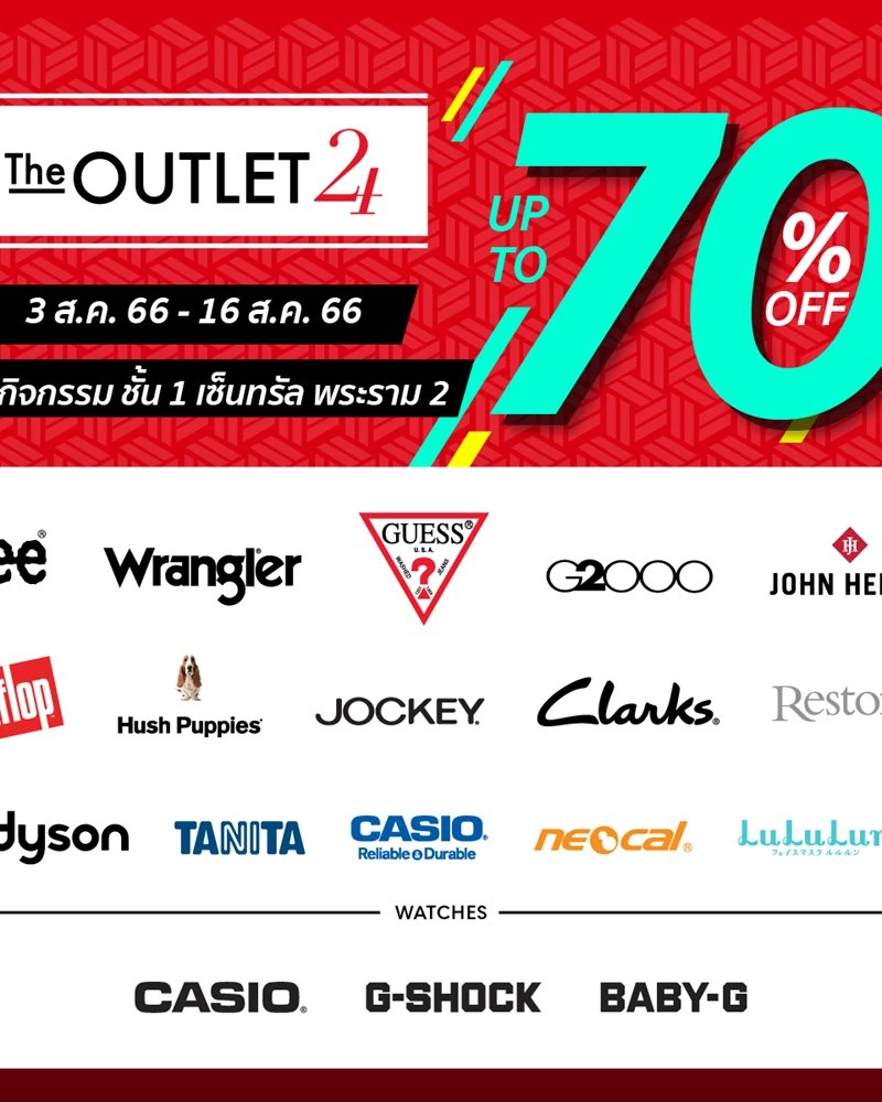 The Outlet 24 ส่งตรงโปรเด็ด! ลดให้ทุกไอเทม จัดเต็มถึง 70% จากแบรนด์ชั้นนำในเครือ cmg อาทิ Lee, Wrangler, Guess, G2000, John henry, FitFlop, Hush Puppies, Jockey, Clarks, Restoria, dyson, Tanita, Casio, neocal, Lululun, G-shock, Baby-G เริ่ม 3 ส.ค. 66 - 16 ส.ค. 66 ณ ลานกิจกรรม ชั้น 1 เซ็นทรัล พระราม 2