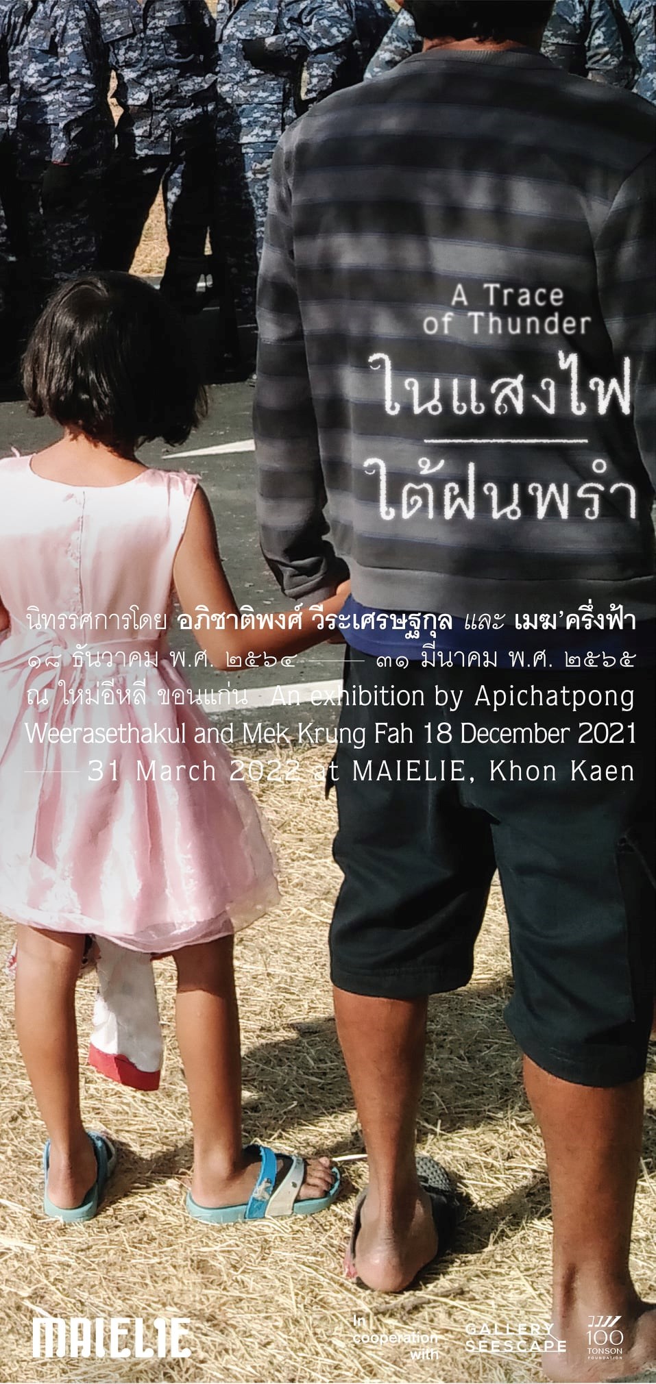 MAIELIE cordially invites you to "A Trace of Thunder," an exhibition by Apichatpong Weerasethakul and Mek’ Krung Fah, their first exhibition in Khon Kaen. A continuation of "A Minor History," accompanied by live poetry reading "Unsubjected Verses," at the 100 Tonson Foundation, Bangkok, this collaboration serves as an act of piecing together the same issues arising from different perspectives.