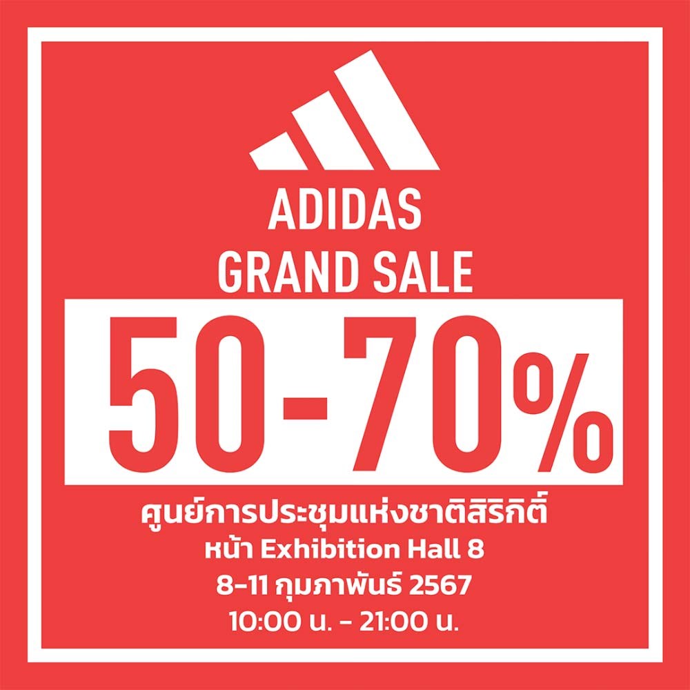 เตรียมช้อปแบบจัดหนัก Adidas Grand Sale กับหลากหลายสินค้าจากแบรนด์ Adidas แบรนด์อุปกรณ์กีฬาและสตรีทแฟชั่น ที่นำมาลดสูงสุดถึง 50 - 70% อาทิ รองเท้าวิ่ง สนีกเกอร์ รองแท้าแตะ เสื้อยืด ชุดออกกำลังกาย กระเป๋าสะพาย หมวก ในราคาพิเศษ