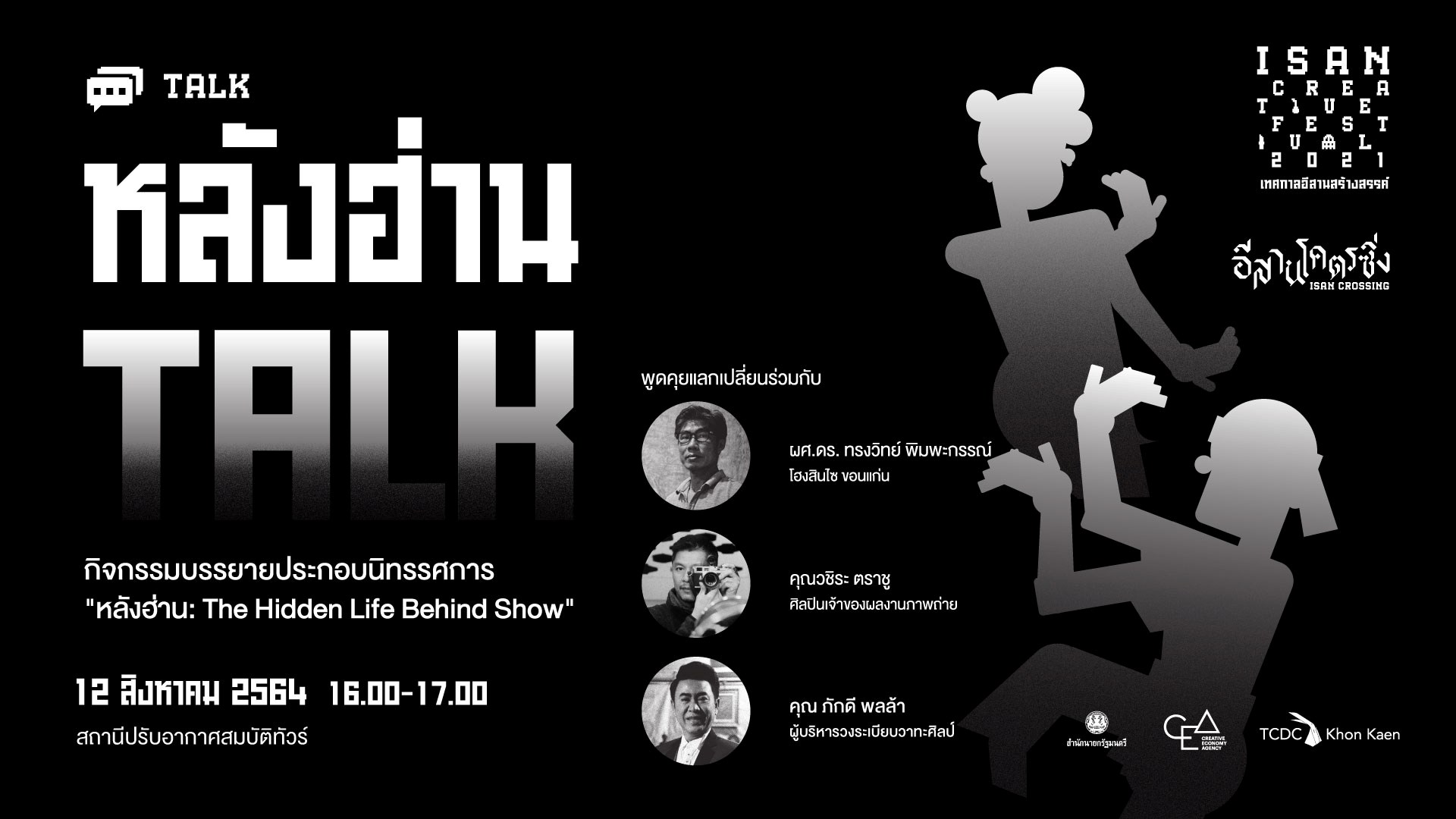 ขอเชิญชวนเข้าร่วมกิจกรรมบรรยายประกอบนิทรรศการ "หลังฮ่าน: The Hidden Life Behind Show" จากเจ้าของวงระเบียบวาทะศิลป์ คุณภักดี พลล้ำ จะมาร่วมแลกเปลี่ยนมุมมองการบริหารจัดการ และวิถีชีวิตของชาวหมอลำที่ต้องดูแลสมาชิกวงกว่า 400 ชีวิต และการปรับตัวในวิกฤต COVID-19 ที่ต้องเผชิญ พูดคุยแลกเปลี่ยนร่วมกับเจ้าของโฮงสินไซขอนแก่น และศิลปินเจ้าของผลงานภาพถ่าย ถึงเวลาแล้วที่เหล่าหมอลำจะต้องปรับตัวและเอาตัวรอดในยุควิกฤต COVID-19