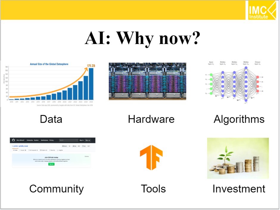 ทุกองค์กรพูดถึง AI (ปัญญาประดิษฐ์) ว่าเป็นแนวโน้มเทคโนโลยีที่จะเข้ามาเปลี่ยนโลกและธุรกิจ บ้างก็เป็นกังวลกับอนาคตของธุรกิจและอุตสาหกรรม บางหน่วยงานที่มีศักยภาพก็เริ่มเตรียมตัวทั้งการเตรียมโครงสร้างพื้นฐานและบุคลากร AI เป็นเรื่องของการนำข้อมูลมาใช้ในการวิเคราะห์ คาดการณ์และพยากรณ์ในเรื่องต่างๆ ซึ่งก็เป็นสิ่งที่มนุษย์ทำอยู่เป็นประจำ แต่ด้วยความสามารถของคอมพิวเตอร์ประกอบกับการใช้ข้อมูลขนาดใหญ่ก็เลยทำให้ทำได้รวดเร็วและมีความแม่นยำกว่ามนุษย์ ดังนั้นงานยากๆ ที่แต่ก่อนทำไม่ได้จึงสามารถทำได้ดีขึ้นในวันนี้ การประยุกต์ใช้ AI จะประกอบด้วยหลายๆ ด้านทั้งการวิเคราะห์ข้อมูล ด้านการฟัง ด้านการมองเห็น ด้านภาษา หรือด้านระบบผู้เชี่ยวชาญ