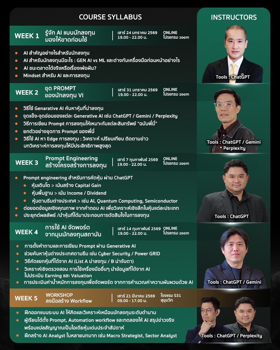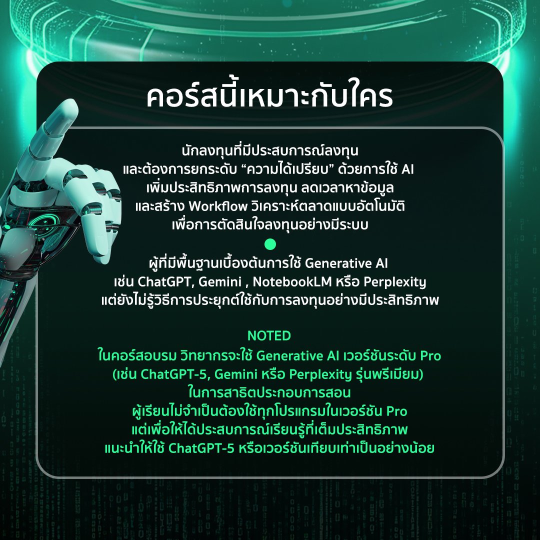 โดยคอร์สอบรมนี้ไม่ได้สอนให้แค่ใช้ AI แต่สอนให้ “คิดและวิเคราะห์แบบนักลงทุนยุคใหม่” ที่รู้จักตั้งคำถามกับข้อมูล รู้เท่าทันอัลกอริทึม และใช้ AI เป็นคู่คิดในการมองอนาคตของตลาดอย่างมีระบบ เพราะในโลกที่ข้อมูลเปลี่ยนทุกวินาที คนที่เข้าใจ AI ก่อน คือคนที่มีโอกาสมากกว่าทุกคนในตลาด