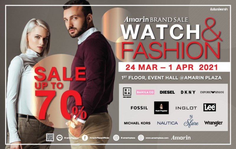 Amarin Brand Sale : Watch&Fashion Sale up to 70% วันที่ 24 มีนาคม 2564 - 1 เมษายน 2564 ณ ลาน Event Hall ชั้น 1 ศูนย์การค้าอัมรินทร์พลาซ่า มาแล้ว EVENT สุดปังชวนช้อปช่วงสิ้นเดือนกับ "Watch&Fashion Sale up to 70%" เอาใจทั้งคุณผู้ชายและคุณผู้หญิง กับนาฬิกาแบรนด์ระดับโลก ลดสูงสุด 70% | เครื่องสำอางค์ ลดเริ่มต้น 30% สูงสุด 70% | เสื้อผ้าแฟชั่นชุดทำงาน โปรแรงราคาเดียว และลดสูงสุด 70% แบรนด์ที่เข้าร่วม Banila Co, 3ina, Inglot, Wrangler, Lee, S'Fare, Emporio Armani, Michael Kors, Diesel, DKNY, Fossil, Hush Puppies Shoes, Nautica