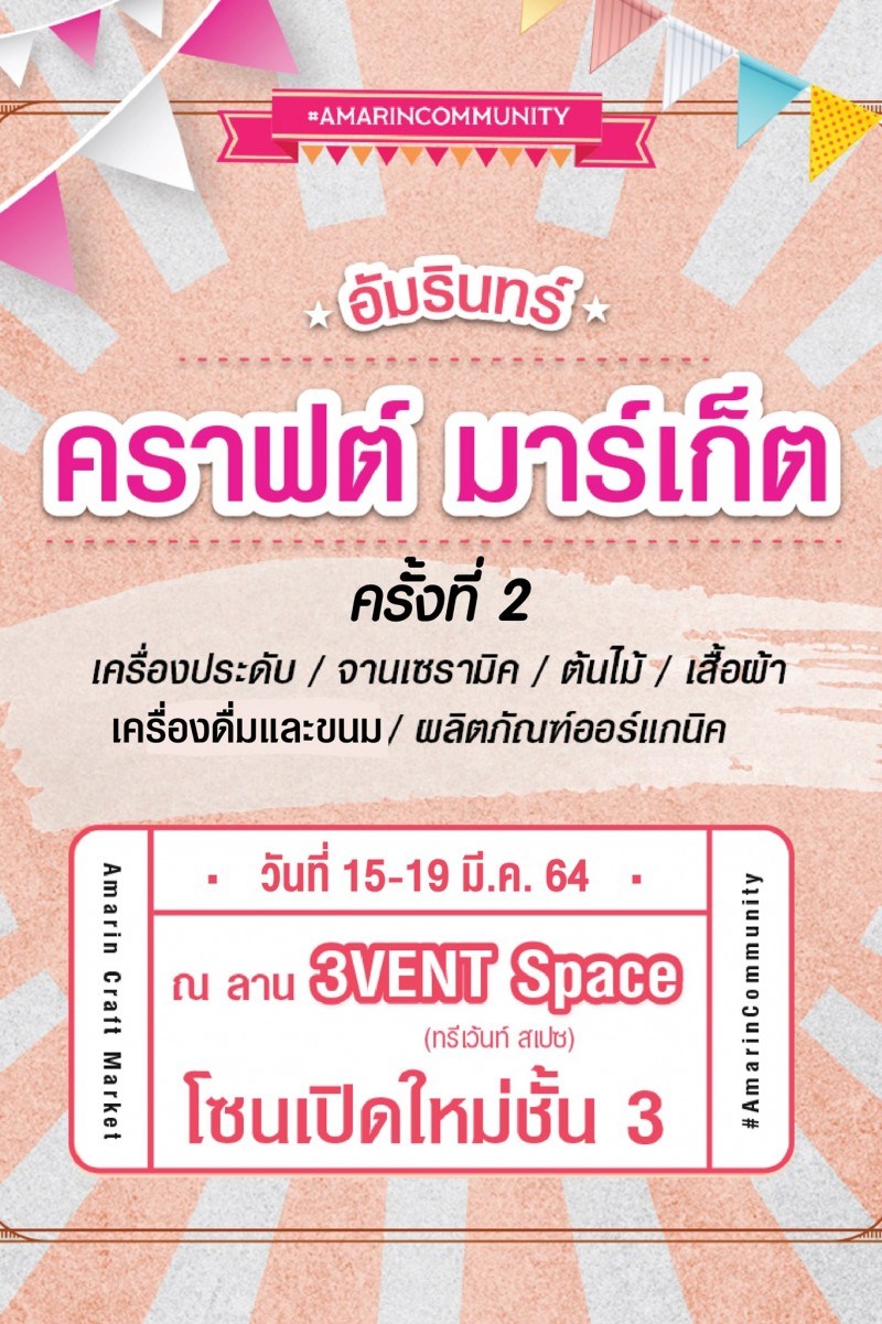 Amarin Craft Market ครั้งที่ 2 วันที่ 15 - 19 มีนาคม 2564 เวลา 10.00 - 18.00 น. ณ 3VENT Space ชั้น 3 ศูนย์การค้าอัมรินทร์พลาซ่า กลับมาอีกครั้งกับ Amarin Craft Market ครั้งที่ 2 เอาใจเหล่านักช้อป พบกับสินค้าน่ารัก ๆ และของใช้ต่าง ๆ ในราคาสบายกระเป๋าในฟีลลิ่งแบบ Market Style มีทั้งต้นไม้ กระถางต้นไม้ที่น่ารักสุด ๆ ของทานเล่น จานเซรามิค เครื่องประดับ เสื้อผ้า และผลิตภัณฑ์ออร์แกนิค ของใช้สำหรับเด็กน้อยจากแบรนด์ Pigeon ชิลขณะช้อปด้วยดนตรีสดจากวง 'Sugarboo' ที่จะมาร้องเพลงเพราะ ๆ ให้ฟังขณะเดิน shopping