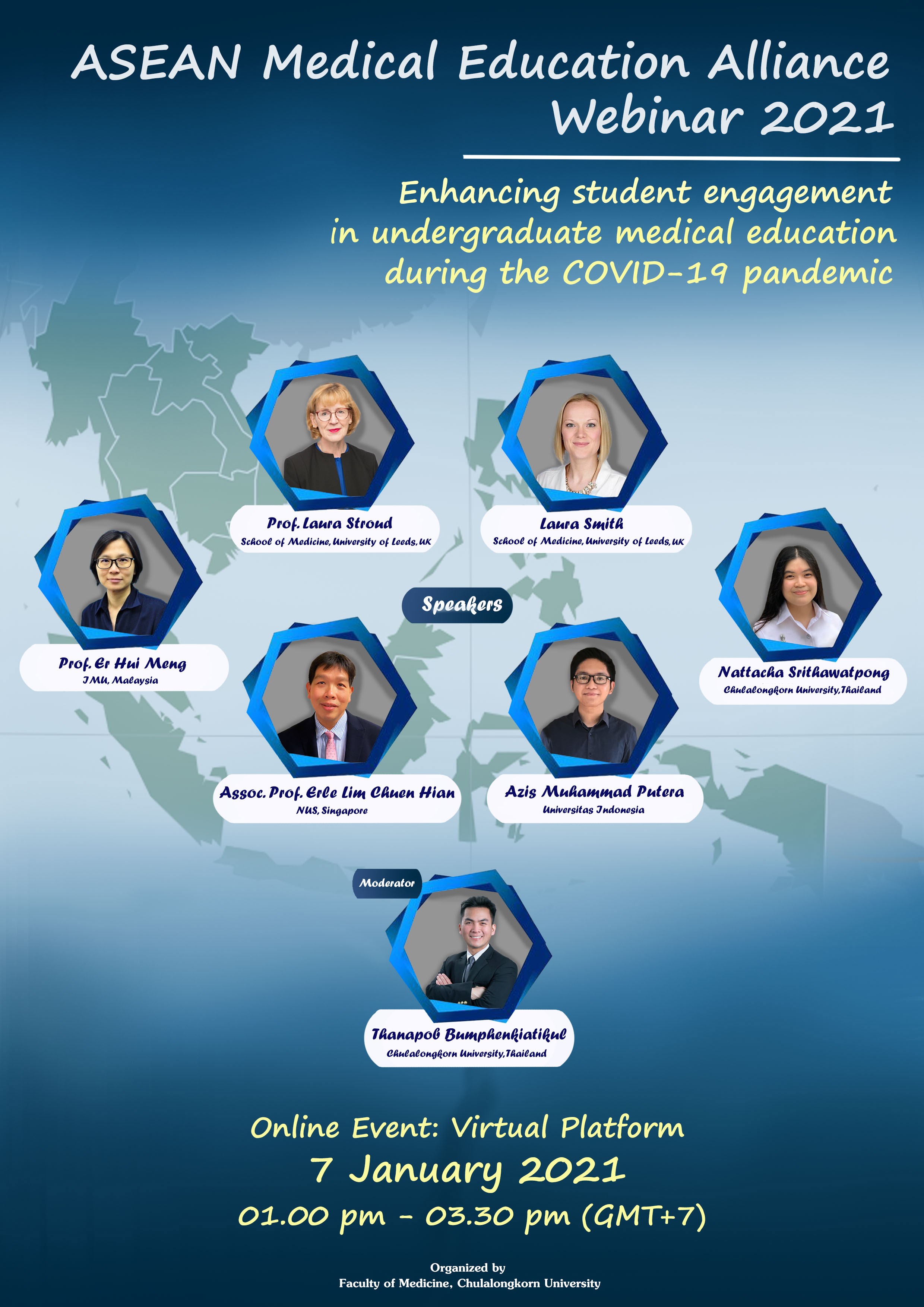 We are pleased to inform you that the Faculty of Medicine, Chulalongkorn University will host ASEAN Medical Education Alliance Webinar 2021 on Thursday, January 7th, 2021 through virtual platform.