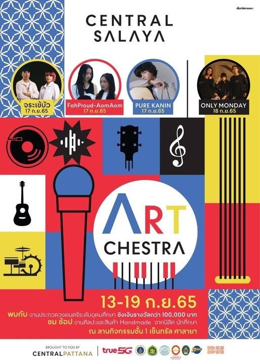Art Chestra วันที่ 13 - 19 กันยายน 2565 ณ ศูนย์การค้าเซ็นทรัล ศาลายา Art Chestra พบกับงานประกวดสุดยอดวงดนตรีระดับอุดมศึกษา "ArtChestra Music Contest 2022" (ครั้งที่ 3) ชิงเงินรางวัลกว่า 100,000 บาท พร้อมเป็นบันไดไปสู่การเป็นศิลปินมืออาชีพ ชม ช้อป งานศิลปะ และสินค้า Handmade จากนิสิต นักศึกษา ชม Mini Concert จากศิลปินที่คุณชื่นชอบ 14-15 ก.ย. : การประกวดวงดนตรีระดับอุดมศึกษา รอบคัดเลือก 17 ก.ย. : ชม Mini Concert จากศิลปิน วง จระเข้บัว, วง FahPround-AomAom, วง Pure Kanin 18 ก.ย. : การประกวดวงดนตรี รอบชิงชนะเลิศ 18 ก.ย. : Mini Concert : วง Only Monday งานเริ่ม 13 - 19 ก.ย. นี้ ณ ลานกิจกรรม ชั้น 1 ศูนย์การค้าเซ็นทรัล ศาลายา