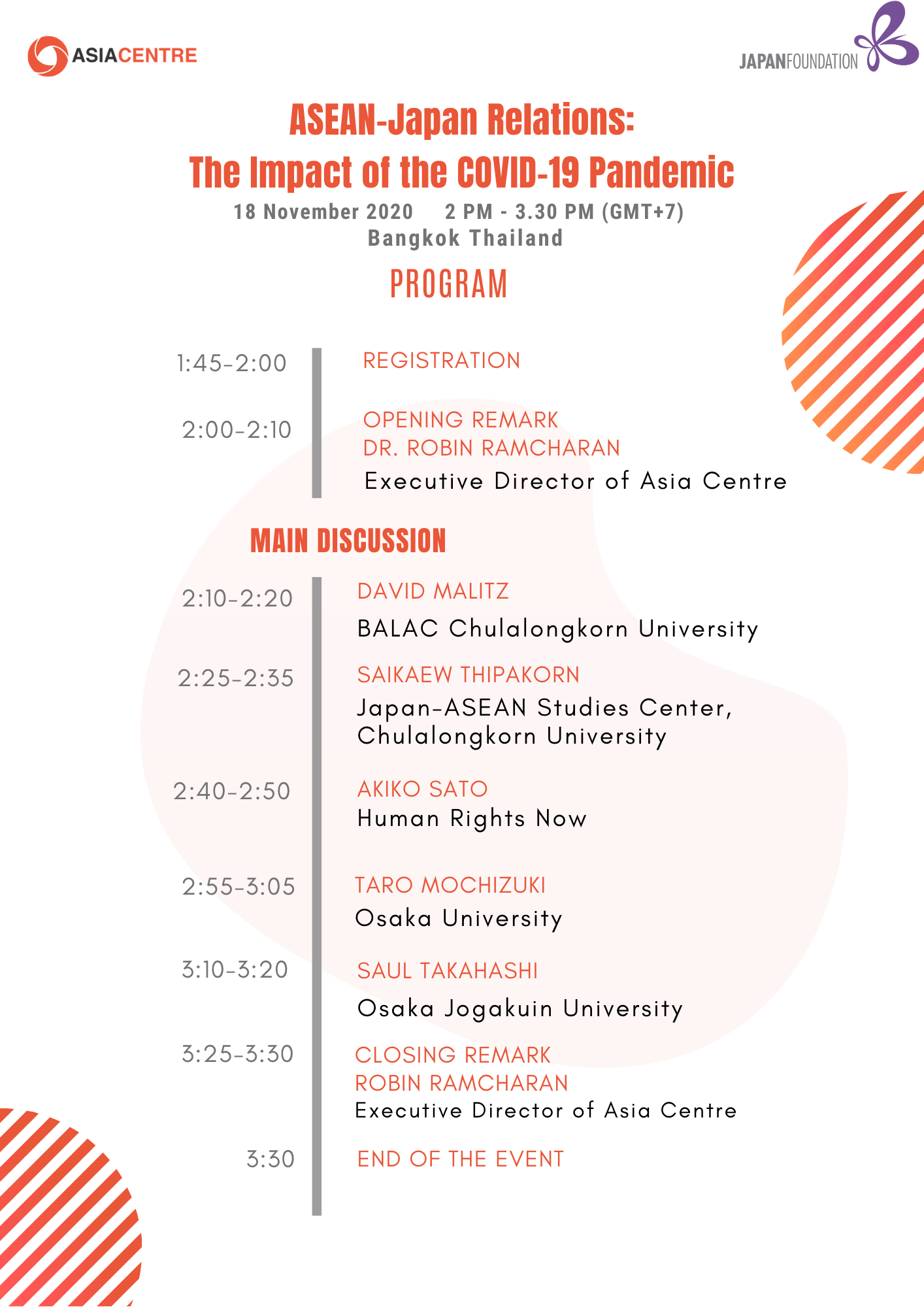 Key Questions: What have been the impact on the economy of Japan and ASEAN? How has it affected people-to-people relations and travel? Have geopolitical developments affected ASEAN-Japan relations. What are the shared learning points that have emerged from this health crisis? What can ASEAN and Japan do in the post-COVID-19 era?