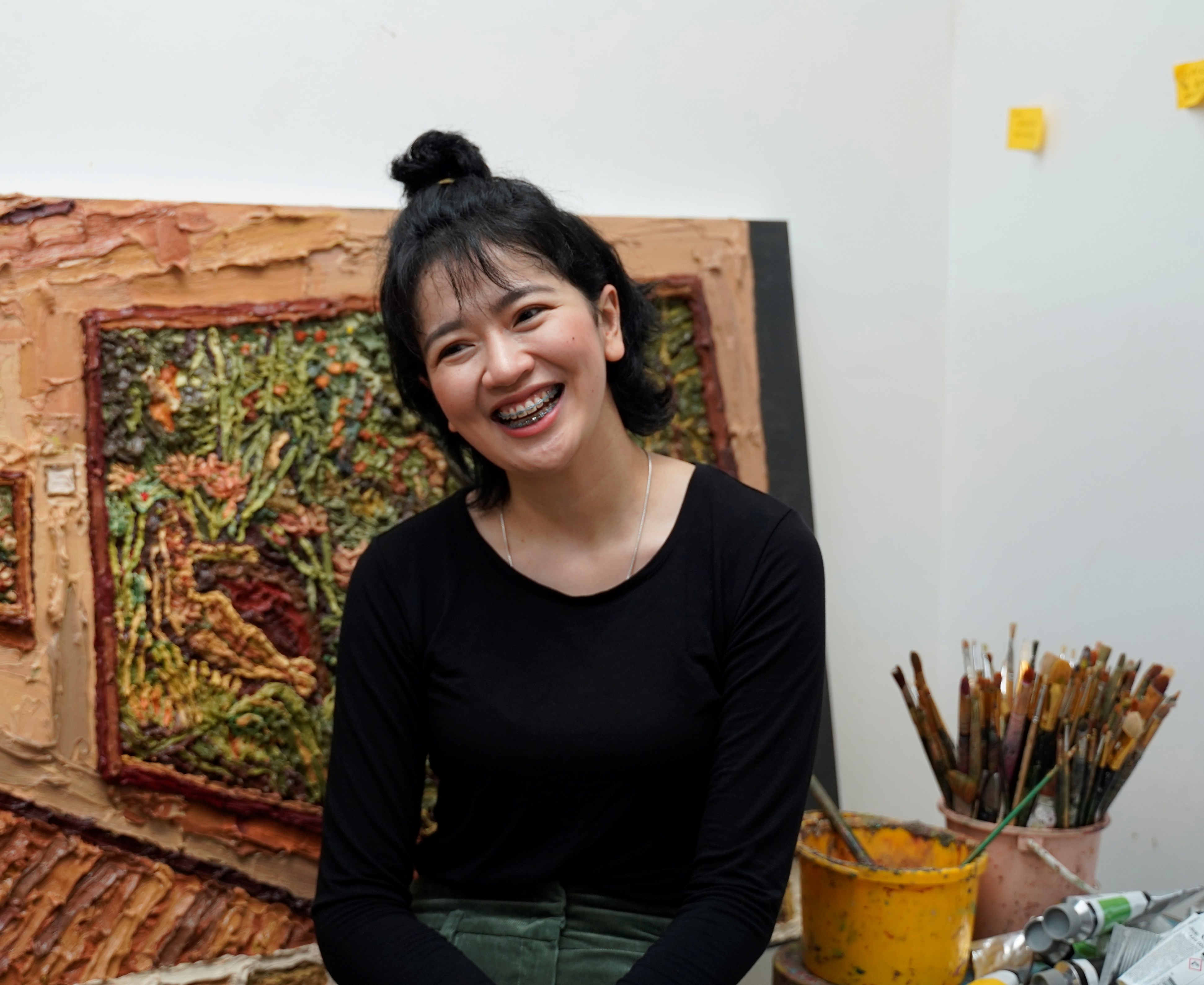 While the COVID-19 pandemic suspended activities and disrupted all aspects of our lives, Jarasporn has been trying to find potential matter from such dire circumstance. As an introvert, socializing and hanging out with others are not her cup of tea. As a result, she spends most of her time painting in the studio. She considers herself lucky for being born and living in the era that digital platforms allow her to stay connected even without leaving the studio.