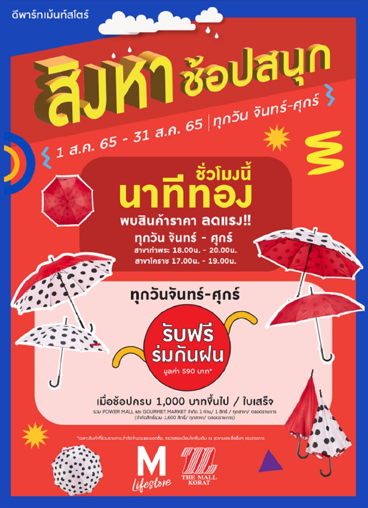เดอะมอลล์ กรุ๊ป จัดแคมเปญ “สิงหา ช้อปสนุก” มอบโปรโมชั่นสุดพีค พบหลากหลายสินค้าแบรนด์ดัง ลดสุดปัง จันทร์-ศุกร์ ตลอดเดือนสิงหาคม เอาใจทั้งสายช้อป รับฟรี ร่มกันฝน มูลค่า 590 บาท สมาชิก M Card เมื่อช้อปภายในห้างฯครบ 1,000 บาทขึ้นไป/ใบเสร็จ (รวม Power Mall และ Gourmet Market) และพิเศษ ชั่วโมงนี้นาทีทอง ขนสินค้าราคาพิเศษ ช้อปไอเท็มเด็ดโดนใจ ในราคาสุดพิเศษ เอาใจสมาชิก M Card แบบจัดเต็ม เดอะมอลล์ไลฟ์สโตร์ ท่าพระ เฉพาะช่วงเวลา 18.00 น.- 20.00 น. และ เดอะมอลล์ โคราช 17.00 น.- 19.00 น. ตั้งแต่วันนี้ - 31 สิงหาคม 2565 ที่ห้างสรรพสินค้า เดอะมอลล์ไลฟ์สโตร์ ท่าพระ และ เดอะมอลล์ โคราช สามารถคลิกซื้อสินค้าได้ตลอด 24 ชั่วโมง ทาง M Online https://monline.com/th, M Online FB https://www.facebook.com/MonlineThailand/, M Card APP http://mcard.to/BT1xU