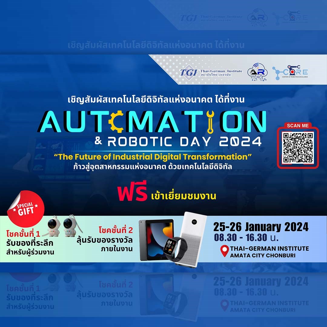 เตรียมพบกับงานทางเทคโนโลยีระบบอัตโนมัติ หุ่นยนต์ และดิจิทัล ครั้งสำคัญ ที่ยิ่งใหญ่ที่สุดอีกงานของสถาบันไทย-เยอรมัน ในงาน Automation & Robotic Day 2024 “The Future of Industrial Digital Transformation : ก้าวสู่อุตสาหกรรมแห่งอนาคตด้วยเทคโนโลยีดิจิทัล” วันที่ 25 - 26 มกราคม 2567 ณ สถาบันไทย-เยอรมัน นิคมอุตสาหกรรมอมตะซิตี้ ชลบุรี
