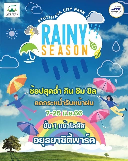 ช้อปเริงร่า...ท้าฝน "AYUTTHAYA CITY PARK RAINY SEASON" แฟชั่นเสื้อผ้า รองเท้า กระเป๋า เครื่องประดับสุดเก๋ ยกขบวนมาให้สาวๆ เลือกช้อป ไม่ตกเทรนด์กัน ช้อปเหนื่อยแล้วเติมพลังกันต่อได้เลย ทั้งของคาว หวาน เครื่องดื่มเพิ่มความสดชื่น วันที่ 7 - 26 มิ.ย. 66 ที่ชั้น 1 หน้าโลตัส ศูนย์การค้าอยุธยาซิตี้พาร์ค