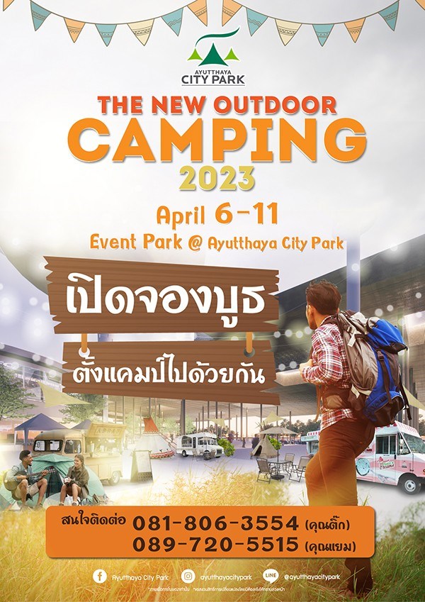 เตรียมพบงานใหญ่ Event "The New Outdoor Camping 2023" ศูนย์รวมคนรักแคมป์ปิ้ง กาแฟ ต้นไม้ และที่พัก วันที่ 6 - 11 เม.ย. 66 (6 วัน) ตื่นตากับการเปิดพื้นที่ใหม่ ใหญ่กว่าเดิม ณ Event Park ศูนย์การค้าอยุธยาซิตี้พาร์ค เปิดจองพื้นที่แล้ววันนี้ รับสมัครร้านค้าออกบูธ ร้าน Drip Coffee Food Truck ร้านต้นไม้ อุปกรณ์แคมป์ปิ้งทุกประเภท รถยนต์ จักรยานยนต์ สไตล์แคมป์ปิ้ง โรงแรม ที่พัก โฮมสเตย์ ทัวร์