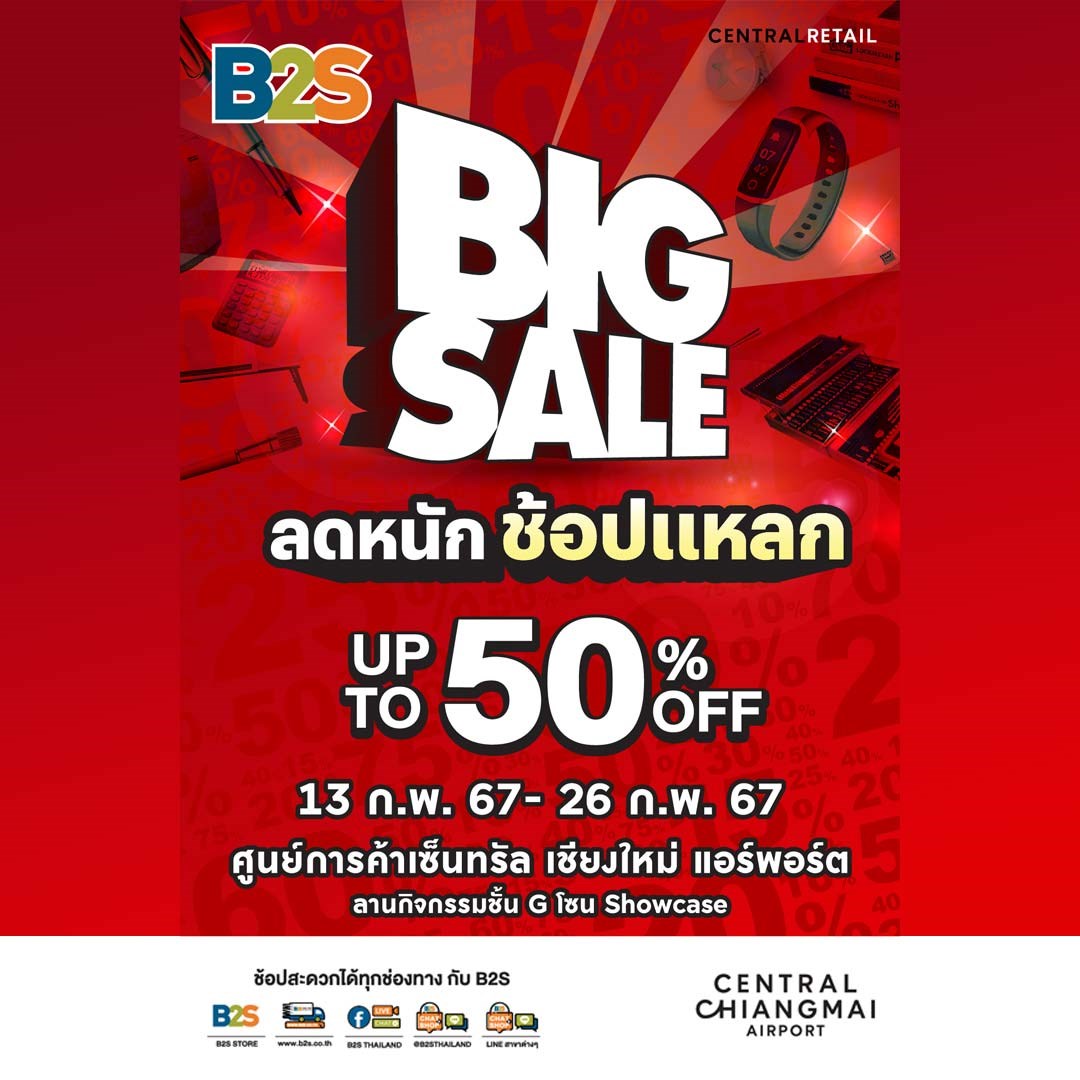 B2S เล่นใหญ่ จัดเต็มลดกระหน่ำ รับเทศกาลวาเลนไทน์ ยกกองทัพสินค้าทั้งห้างฯ จากแบรนด์ดัง B2S มาพร้อมสินค้าราคาพิเศษ! ลดสูงสุด 50% วันที่ 13 - 26 กุมภาพันธ์ 2567 ณ ลานกิจกรรมชั้น G เซ็นทรัลเชียงใหม่ แอร์พอร์ต