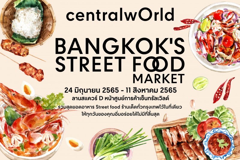 รวมสุดยอดอาหาร ละลานตากับไทยสตรีทฟู้ดร้านดังร้านเด็ดทั่วกรุงเทพไว้ที่งาน "Bangkok's Street Food Market" at centralwOrld รวมร้านดัง อาทิ บ้าบิ่นวรลักษณ์, ข้าวม่อนแซ่บ, Shong Cha Brown Sugar, ไมโลรถโรงเรียน, ก๋วยเตี๋ยวต้มยำสุโขทัย, ทอดแหลก, ลอดช่องวัดเจษ, ลูกชิ้นพอเพียง, หมึกย่างแดนมังกร และอีกมากมายหลากหลายประเภท ตั้งแต่วันที่ 24 มิ.ย. 65 - 11 ส.ค. 65 ณ ลาน Square D ด้านหน้าศูนย์การค้าเซ็นทรัลเวิลด์