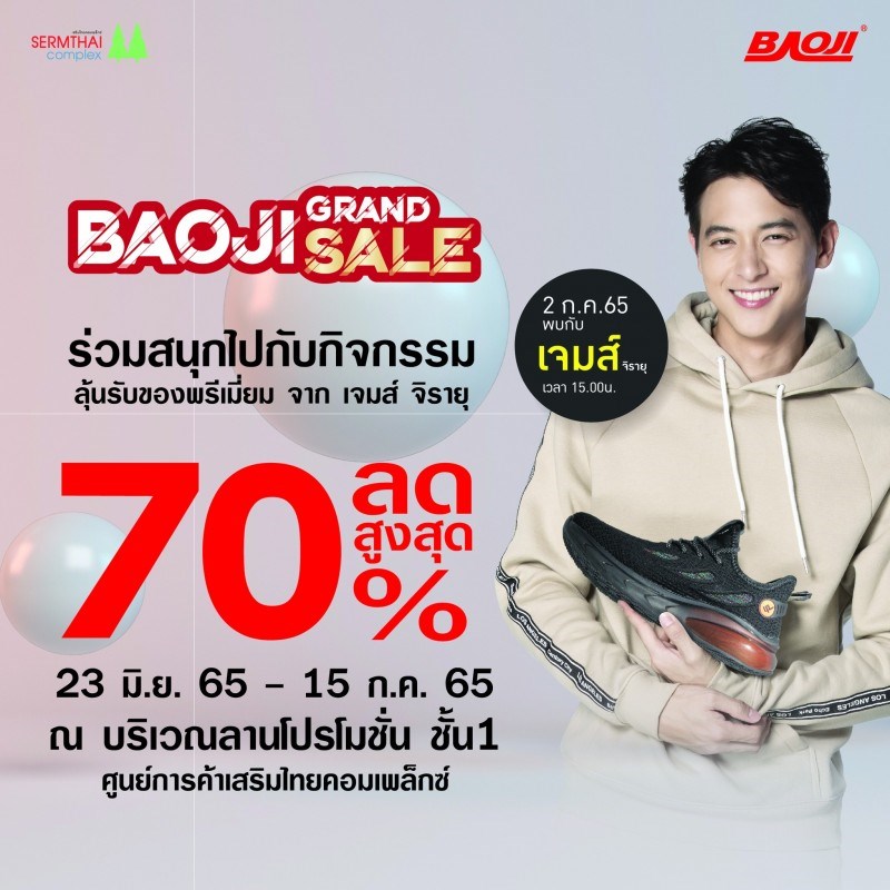 BAOJI Grand Sale วันที่ 23 มิถุนายน - 15 กรกฎาคม 2565 ณ ศูนย์การค้าเสริมไทยคอมเพล็กซ์ กลับมาอีกครั้ง กับงาน "บาโอจิ แกรนด์เซล" ร่วมกรี๊ดไปกับพระเอกหนุ่ม "เจมส์ จิรายุ" ที่จะมาร่วมสร้างความสนุกสนานบนเวที ร่วมเล่นเกมส์ พร้อมกับกิจกรรมสุดฟิน ในวันเสาร์ที่ 2 กรกฎาคมนี้ พิเศษในวันงาน! ซื้อสินค้าครบ 3,000 บาท รับผ้าห่มฟรี 1 ผืน พร้อมลงทะเบียนถ่ายภาพบนเวที กับหนุ่ม เจมส์ จิรายุ ที่ลานโปรโมชั่น ชั้น 1 เสริมไทยคอมเพล็กซ์ รองเท้าผ้าใบ บาโอจิ ซื้อ 1 แถม 1 รองเท้าแตะ ซื้อ 1 คู่ 299 บ. ซื้อ 2 คู่ 499 บาท และ สินค้าสุด Exclusive ราคาปกติ 1,590 ถึง 1,990 บาท ลดเหลือเพียง 1,200 บาท สินค้าราคานาทีทอง 490 บาท ทุกคู่ พิเศษ! เพียงคุณซื้อสินค้าภายในงาน ครบ 1,200 บาท รับสิทธิ์หมุนวงล้อรับสินค้าสมนาคุณฟรี 1 ชิ้น และซื้อครบ 3,000 บาท รับผ้าห่มฟรี 1 ผืน ตั้งแต่วันที่ 23 มิถุนายน - 15 กรกฎาคม 2565 ที่ลานโปรโมชั่น ชั้น 1 เสริมไทยคอมเพล็กซ์