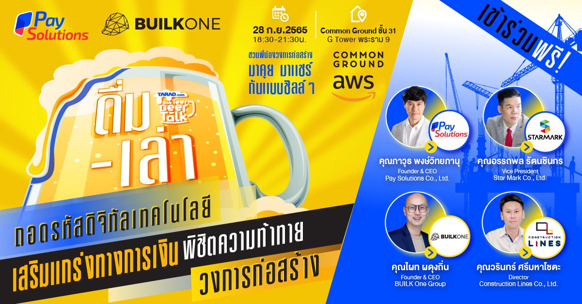 Pay Solutions ร่วมกับ BUILK One Group ชวนคนวงการก่อสร้างมา "ดื่ม-เล่า" คุยกันเเบบมันๆ เรื่องการบริหาร Cashflow เเละดิจิทัลเทคโนโลยีสำหรับวงการก่อสร้าง