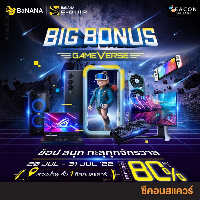 Big Bonus Game Verse วันที่ 20 - 31 กรกฎาคม 2565 ณ ซีคอนสแควร์ สายไอทีเตรียมเงินให้พร้อม! เเล้วมาช้อปสนุก ทะลุทุกจักรวาลกับ Big Bonus Game Verse บอกเลยว่าเราขนทัพสินค้าไอทีลดสูงสุด 90%* มาอย่างคับคั่ง! โปรโมชั่นพิเศษภายในงาน! สินค้า Apple ลดสูงสุด 70%* Smartphone ลดสูงสุด 70%* Accessories ลดสูงสุด 80% ผ่อน 0% นานสูงสุด 36 เดือน | เครดิตเงินคืนสูงสุด 18,000.- | ใช้คะแนนแลกรับเครดิตเงินคืนสูงสุด 50% กับบัตรเครดิตที่ร่วมรายการ เเละโปรฯเด็ดอีกมากมาย พบกับกิจกรรมพิเศษ BaNANA Cosplayer Contest 2022 ชิงรางวัลรวมมูลค่ากว่า 37,000.- รับสิทธิ์ซื้อ PlayStation5 Digital Edition มูลค่า 13,990.- ทันที เมื่อซื้อสินค้า Gaming Gear ครบ 15,000.-* ขึ้นไป/ ใบเสร็จ (1 คน ต่อ 1 สิทธิ์) ทดลองเล่นเกมฟรี! PlayStation5, Oculus Quest, Nintendo Switch ภายในงานเท่านั้น! ลดหนักจัดเต็มขนาดนี้ ไม่มาไม่ได้เเล้ว! ในงาน "Big Bonus Game Verse" วันที่ 20 - 31 ก.ค. 65 ณ ลานน้ำพุ ชั้น 1 ซีคอนสแควร์
