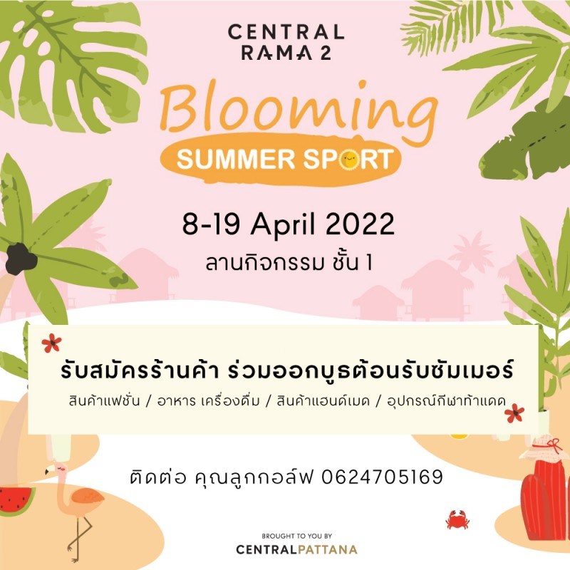 วันที่ 8 - 19 เมษายน 2565 ณ เซ็นทรัล พระราม 2 หน้าร้อนมาแล้ว ต้อนรับซัมเมอร์กับงาน Blooming Summer Sport ขอชวนพ่อค้าแม่ค้ามาออกบูธต้อนรับ Summer 8 - 19 เม.ย. 65 หากคิดว่าสินค้าเข้าคอนเซปต์ซัมเมอร์ ก็ติดต่อมาได้เลยยยย ไม่ว่าจะเป็น เสื้อผ้าแฟชั่น, พร็อพถ่ายรูป หมวก แว่น, อาหาร เครื่องดื่ม หรือจะเป็นอุปกรณ์กีฬาท้าแดดก็ได้หมด