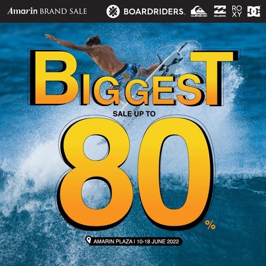 BOARDRIDERS BIGGEST SALE วันที่ 10 - 18 มิถุนายน 2565 ณ ศูนย์การค้าอัมรินทร์พลาซ่า BOARDRIDERS BIGGEST SALE UP TO 80% งานเซลครั้ง มโหฬาร ที่รวบรวมแบรนด์ สุดแซ่บ อย่าง Quiksilver, BILLABONG, ROXY และ DC ที่ขนขบวนมาลด ถล่มทลายสูงสุดถึง 80% ตั้งแต่วันที่ 10 - 18 มิ.ย. 2565 เวลา 10.00 - 20.00 น. ณ ลาน Event Hall ชั้น 1 ศูนย์การค้าอัมรินทร์พลาซ่า