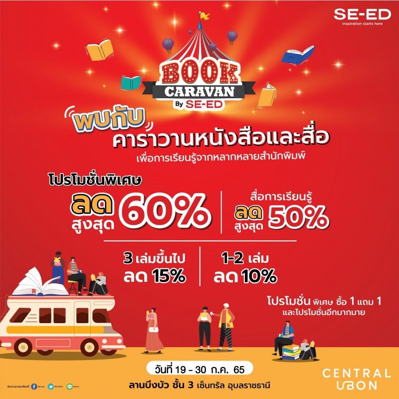 BOOK CARAVAN by SE-ED BOOK CENTER วันที่ 19 - 30 กรกฎาคม 2565 ณ เซ็นทรัล อุบล เตรียมพบกับ BOOK CARAVAN by SE-ED BOOK CENTER พบกับคาราวานหนังสือและสื่อการเรียนรู้จากหลากหลายสำนักพิมพ์ พร้อมโปรโมชั่นสุดพิเศษลดสูงสุด 60% และสื่อการเรียนรู้ลด 50% พร้อมโปรโมชั่นพิเศษซื้อ 1 แถม 1 วันที่ 19 - 30 ก.ค. 65 ที่ ลานบึงบัว ชั้น 3 เซ็นทรัล อุบล