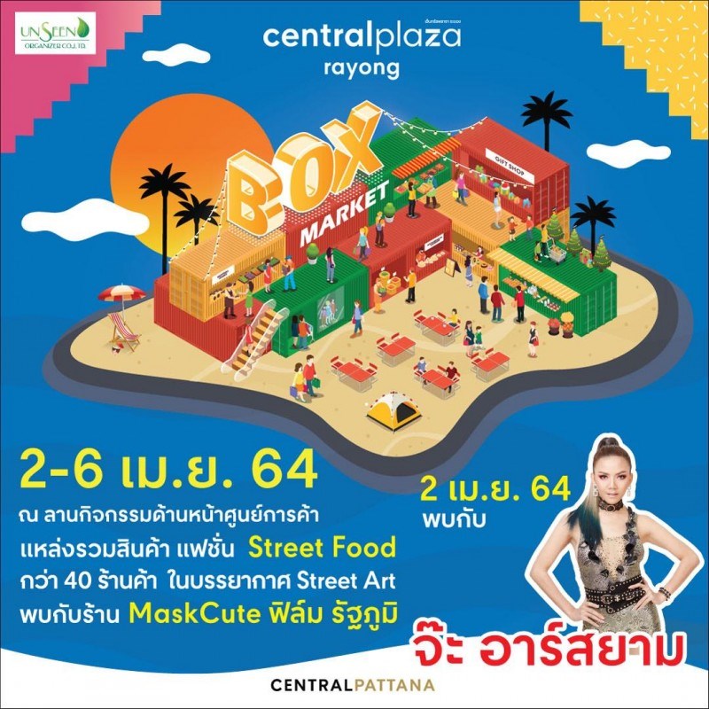 BOX MARKET วันที่ 2 - 6 เมษายน 2564 ณ ลานกิจกรรมหน้าศูนย์การค้าเซ็นทรัลพลาซา ระยอง BOX MARKET พบกับตู้คอนเทนเนอร์ที่รวบรวมร้านค้า ร้านอาหารสตรีทฟู้ดมากกว่า 60 ร้านค้า ชิมหลากหลายเมนูเเสนอร่อย ในบรรยากาศแนว Street Art ชมการแสดงสดของวงดนตรี Acoustic ในทุกวัน