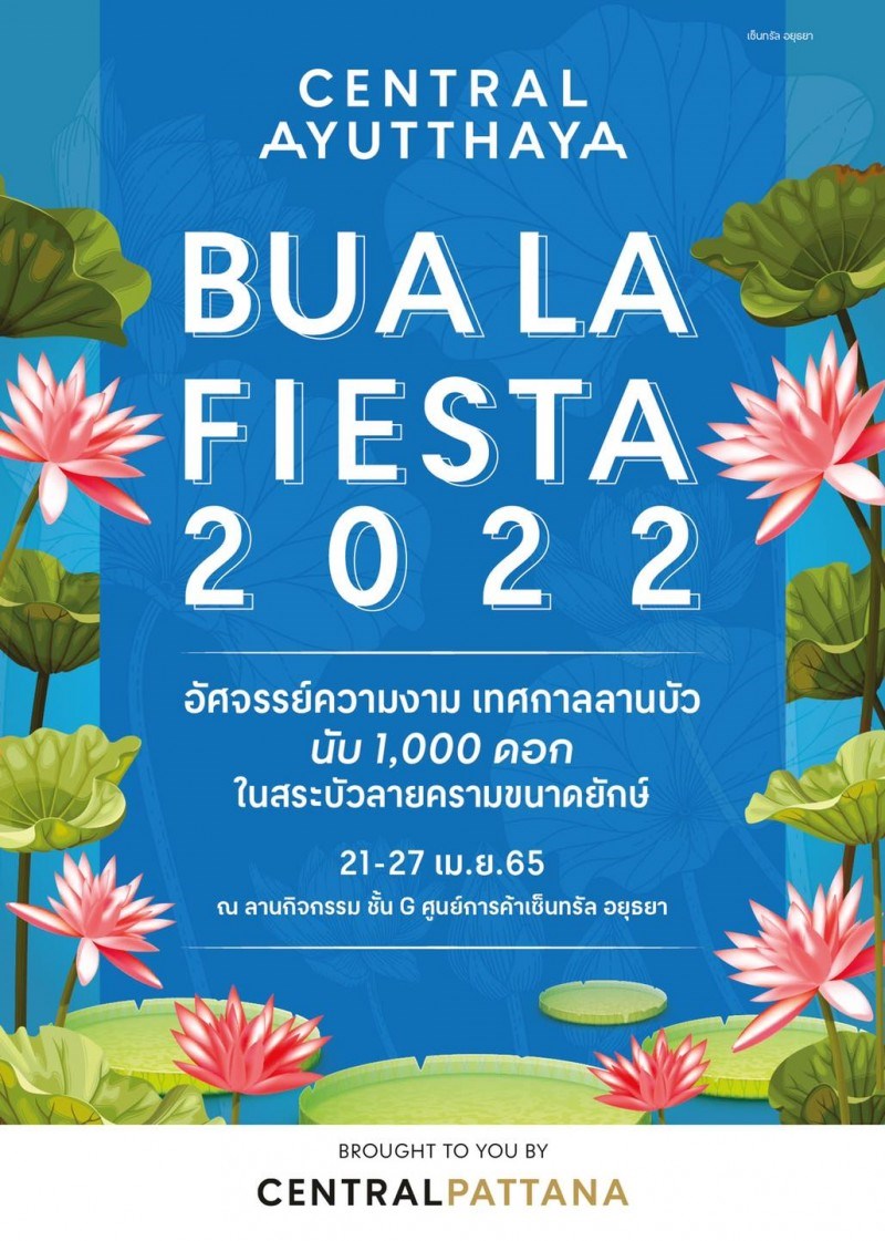 BUA LA FIESTA 2022 วันที่ 21 - 27 เมษายน 2565 ณ เซ็นทรัล อยุธยา อัศจรรย์ความงาม เทศกาลลานบัว BUA LA FIESTA 2022 พบกับราชินีแห่งไม้น้ำในสระลายครามขนาดยักษ์ พร้อมจุดถ่ายรูปใจกลางสระบัวแบบ 360 องศา ประดับด้วยดอกบัวเรืองแสง ที่แรกและที่เดียว
