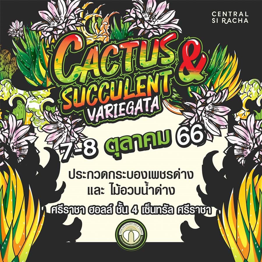 CACTUS & SUCCULENT VARIEGATA เซ็นทรัล ศรีราชา ร่วมกับชมรมกระบองเพชรและไม้อวบน้ำแห่งประเทศไทย ยกกองทัพกระบองเพชร ไม้อวบน้ำ ไม้ด่างนานาชนิด กระถาง อุปกรณ์เพาะปลูกและของแต่งสวน มาให้ช้อป ครบ จบ ในงานนี้แน่นอน นอกจากนี้ภายในงานยังมีกิจกรรมประกวดไม้ด่างทุกสายพันธุ์ มาร่วมให้กำลังใจ และเลือกช้อปต้นไม้กันได้