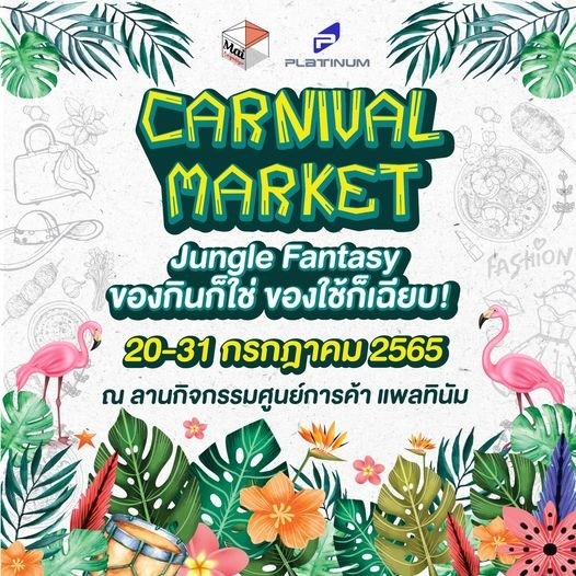 Carnival Market วันที่ 20 - 31 กรกฎาคม 2565 ณ ศูนย์การค้า แพลทินัม มาช้อปปิ้งสุดชิลล์ ในงาน Carnival market - Jungle Fantasy ป่าฝนแห่งสีสัน ของกินก็ใช่ ของใช้ก็เฉียบ ยกขบวนอาหารมาเสิร์ฟแบบจุใจ ทั้ง อาหารสตรีทฟู้ด ของทานเล่น ผลไม้ และเครื่องดื่ม พร้อมสินค้าแฟชั่น ของที่ระลึกให้คุณช้อปเพลิน ๆ มากกว่า 60 ร้านค้า ให้คุณได้ช้อปแบบไม่มีเบื่อ ณ ลานกิจกรรมด้านหน้า ศูนย์การค้า แพลทินัม