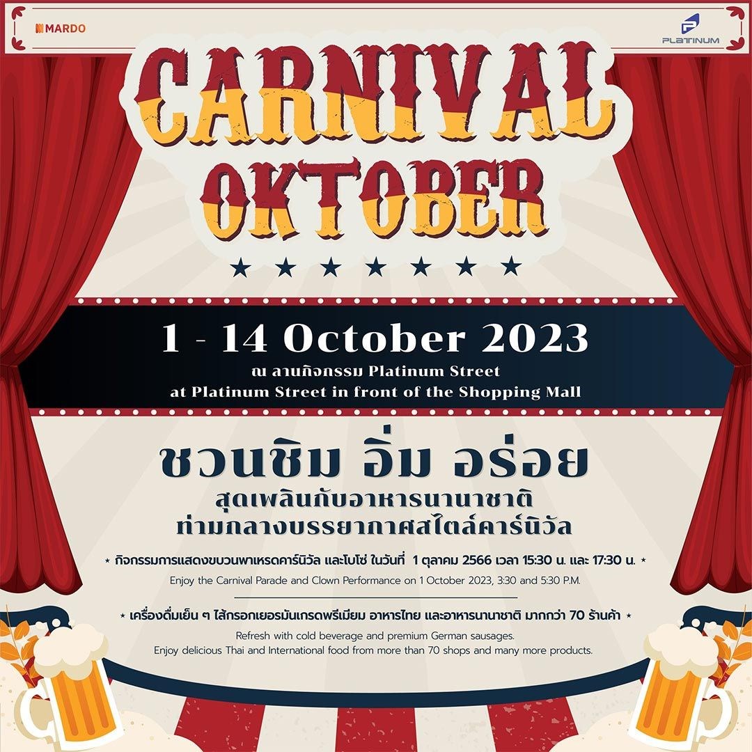 CARNIVAL OKTOBER ชวนชิม อิ่ม อร่อย สุดเพลินกับอาหารนานาชาติ ท่ามกลางบรรยากาศสไตล์คาร์นิวัล พร้อมเครื่องดื่มเย็น ๆ ไส้กรอกเยอรมันเกรดพรี่เมียม อาหารไทย และอาหารนานาชาติ มากกว่า 70 ร้านค้า วันที่ 1 - 14 ต.ค. 66 พิเศษ! ชมกิจกรรมการแสดงขบวนพาเหรดคาร์นิวัล และโบโซ่