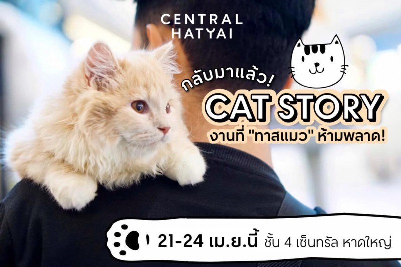 CAT STORY วันที่ 21 - 24 เมษายน 2565 ณ เซ็นทรัล หาดใหญ่ กลับมาแล้ว CAT STORY งานแมวแห่งปี ที่ทาสแมวห้ามพลาด! กับการรวมแมวหลากสายพันธุ์ Cat Studio ถ่ายรูปพร้อมปริ้นท์ Cat Cafe คาเฟ่แมวสุดคิวท์ กิจกรรมและสินค้าแมว ๆ อีกมากมาย วันที่ 21 - 24 เม.ย. 65 ณ ลานกิจกรรม ชั้น 4 เซ็นทรัล หาดใหญ่