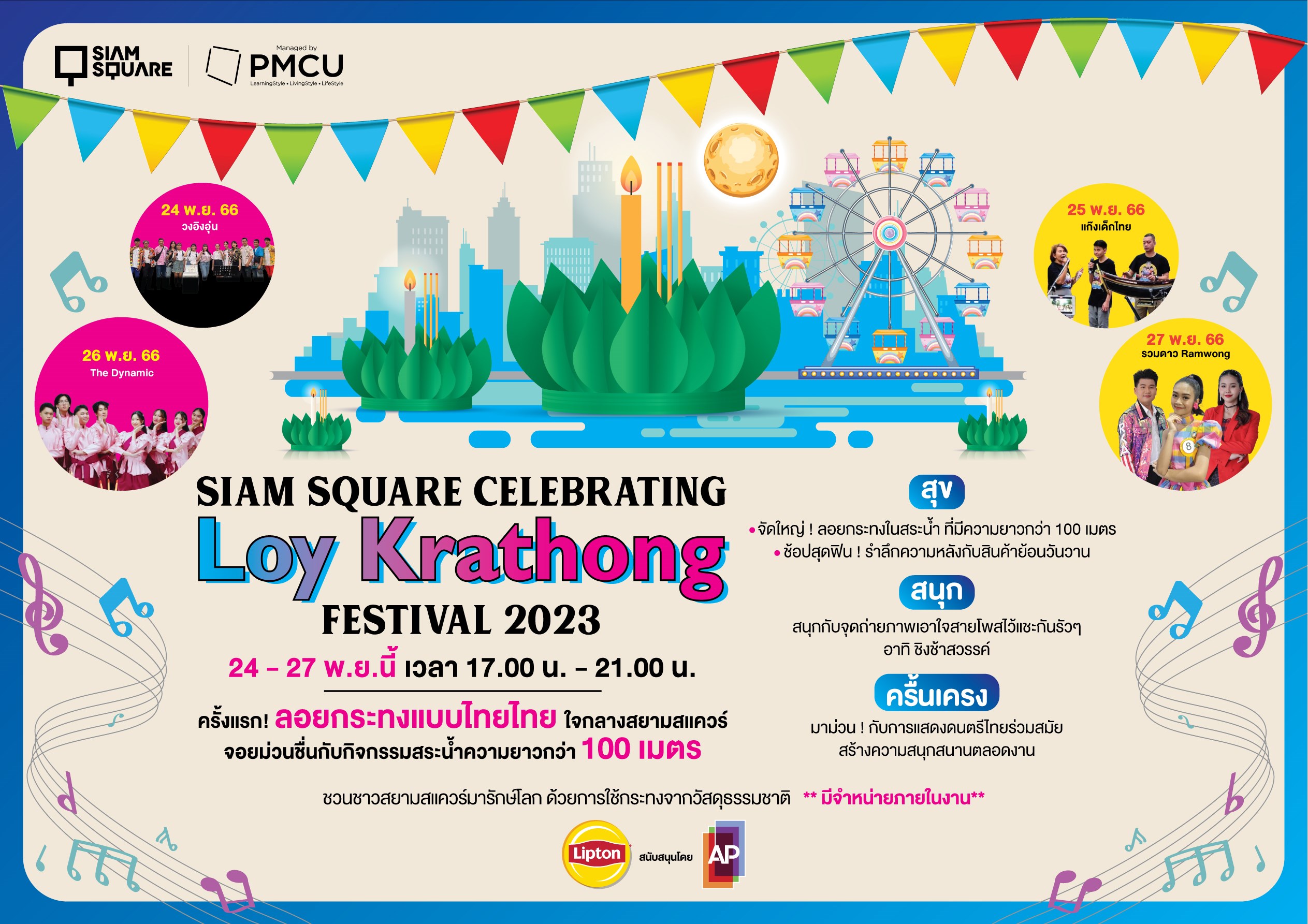 PMCU ชวนสืบสานประเพณีแห่งสายน้ำของไทยในงาน “Siam Square Celebrating Loykrathong Festival 2023” ที่ชวนรักษ์โลกด้วยการลอยกระทงจากวัสดุจากธรรมชาติ ตื่นตา ตื่นใจกับกิจกรรม “สุข สนุก ครื้นเครง” กับประเพณีลอยกระทงครั้งแรกใจกลางสยามสแควร์ ระหว่างวันที่ 24-27 พฤศจิกายน 2566 17.00 น. – 21.00 น. ณ SIAM SQUARE WALKING STREET