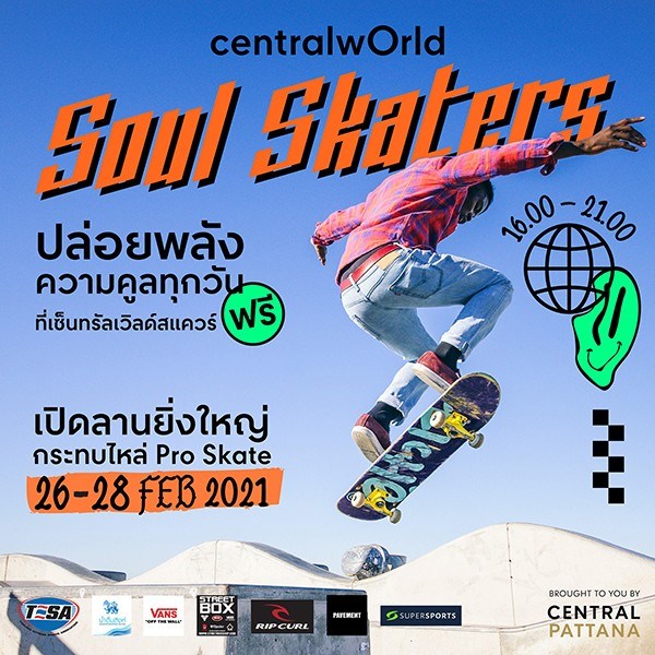 centralwOrld Soul Skaters วันที่ 26 - 28 กุมภาพันธ์ 2564 ณ เซ็นทรัลเวิลด์ ขอนัดเด็กบอร์ดมาปลดปล่อยความคูลไถบอร์ดรู้ใจในท่าสุดพริ้ว ที่ลานด้านหน้าศูนย์ฯ บนพื้นที่ขนาดใหญ่ รายล้อมด้วยวิวใจกลางเมืองที่สวยที่สุด พร้อมไถบอร์ดกระทบไหล่คนดังในวงการ Skate และเรียนรู้ทักษะคูล ๆ กับนักกีฬาทีมชาติที่เตรียมพร้อมไปโอลิมปิก จัดเต็มกับ Sketers Market จำหน่ายอุปกรณ์เล่นสเก็ตจากแบรนด์ Skate Experts ได้แก่ Rip Curl, Roxy และ Pavement ที่นำสินค้า Limited Edition รวมถึงบอร์ด Special Edition ที่ Sold Out ไปแล้ว มาให้ทุกคนได้ยลโฉมบอร์ดนี้อีกครั้ง พร้อม Accessories และไอเทมต่าง ๆ ที่เหล่า Skaters ไม่มีไม่ได้ ! พิเศษ! พบเวิร์กช้อปจากนักกีฬาสเก็ตบอร์ดของสมาคมกีฬาเอ็กซ์ตรีมแห่งประเทศไทย ที่จะมาแนะนำเทคนิคดี ๆ ทุกวันเสาร์ เวลา 17.00 - 19.00 น. ตลอดเดือนมีนาคม ติดตามการลงทะเบียนเข้าร่วมเร็ว ๆ นี้ วันที่ 26 - 28 ก.พ. 2564 เปิดลาน 16.00 - 21.00 น.