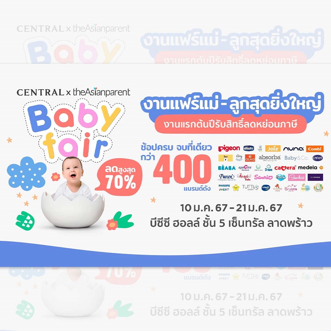 ห้ามพลาด! Central x theAsianparent Baby Fair งานแฟร์สินค้าแม่-ลูกสุดยิ่งใหญ่ งานแรกต้นปี ลดสูงสุด 70% พร้อมรับสิทธิ์ลดหย่อนภาษี วันที่ 10 - 21 มกราคม 2567 ที่ BCC Hall ชั้น 5 เซ็นทรัล ลาดพร้าว เวลา 10.00 - 20.00 น. (จันทร์-พฤหัสบดี), เวลา 10.00 - 21.00 น. (ศุกร์-อาทิตย์)