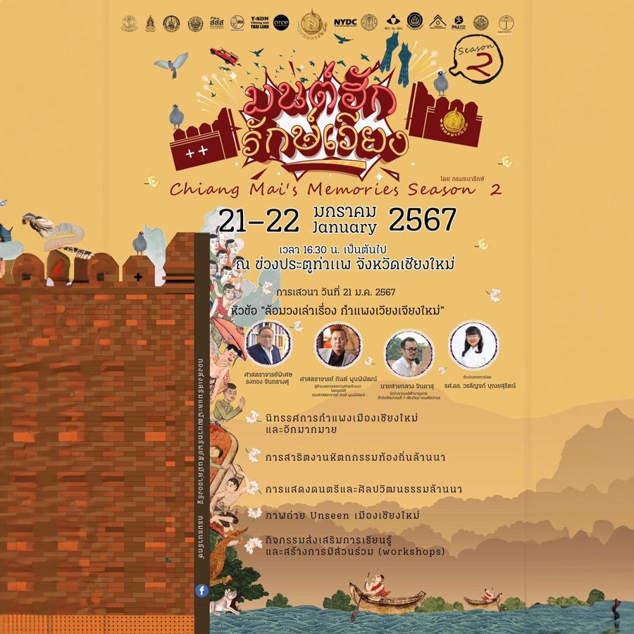 ระหว่างวันที่ 21-22 มกราคม 2567 ณ ข่วงประตูท่าแพ จังหวัดเชียงใหม่ ตั้งแต่เวลา 16.30 น. เป็นต้นไป