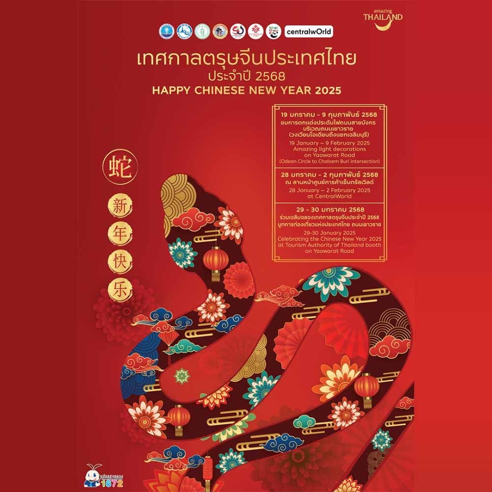 เทศกาลตรุษจีน ประจำปี 2568 ททท. จัดงานในพื้นที่ศูนย์การค้าเซ็นทรัลเวิลด์ วันที่ 28 มกราคม - 2 กุมภาพันธ์ 2568 โดยต้อนรับผู้เข้าร่วมงานด้วยไฮไลต์ Art Installation แลนด์มาร์กรูปงูฉลุลายประดับไฟขนาดใหญ่ องค์เจ้าแม่กวนอิมและเทพเจ้าที่ชาวจีนนับถือ พร้อมจำลองชุมชนชาวจีนขนาดใหญ่และมีเอกลักษณ์ที่น่าสนใจได้แก่ ชุมชนจีนโบราณบ้านชากแง้ว จ.ชลบุรี และชุมชนจีนตลาดน้อย ศาลเจ้าโรงเกือก เพื่อให้ผู้ร่วมงานได้สัมผัสบรรยากาศและเสน่ห์แห่งวัฒนธรรมอย่างใกล้ชิด รวมทั้งยังมีกิจกรรมสาธิตวัฒนธรรมไทย-จีน 4 กิจกรรม ได้แก่ การเขียนพู่กันจีน ศิลปะการตัดกระดาษจีน การเขียนหัวโขน การทำว่าวจุฬา และการตัดกระดาษ รวมถึงการออกร้านอาหารที่มีชื่อเสียงในสื่อสังคมออนไลน์จำนวนกว่า 30 ร้าน พร้อมด้วยการแสดงศิลปินตลอด 6 วัน ได้แก่วง MEAN วง HERS, Tilly birds, Landokmai, Scrubb, Whal & Dolph, ต้าห์อู๋ พิทยา, PAIINNTT, Bowkylion, Better Weather, bamm และ Risa Narisa