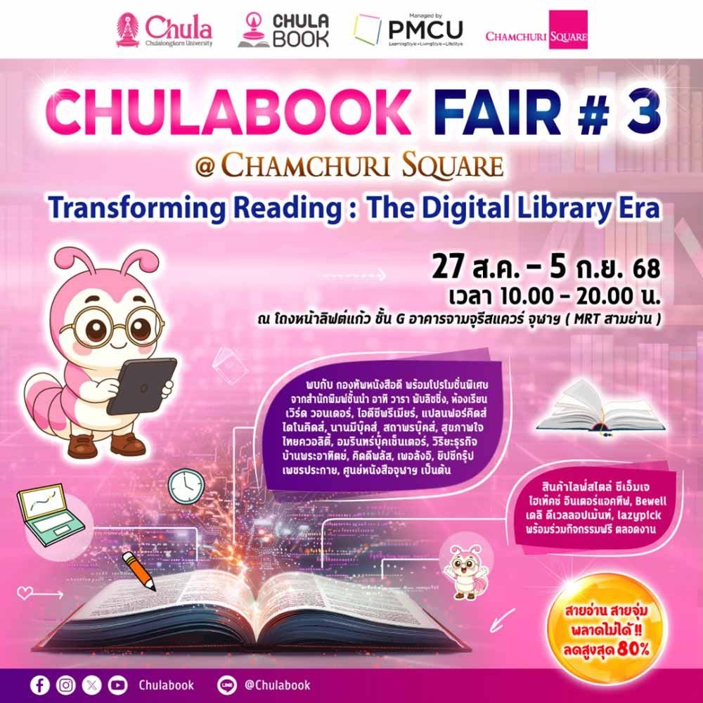 กลับมาอีกครั้ง! งาน CHULABOOK FAIR #3 @CHAMCHURI SQUARE พบกับมหกรรมหนังสือและไลฟ์สไตล์สุดคุ้ม ลดสูงสุดกว่า 80% หนังสือหลากหลายสาย ไม่ว่าจะเป็นวรรณกรรม, บริหาร, ภาษา, เทคโนโลยี, การแพทย์ ฯลฯ พร้อมสินค้าไลฟ์สไตล์สุดชิคให้ช้อปเพลิน! สายอ่าน สายช้อป ห้ามพลาดเด็ดขาด!